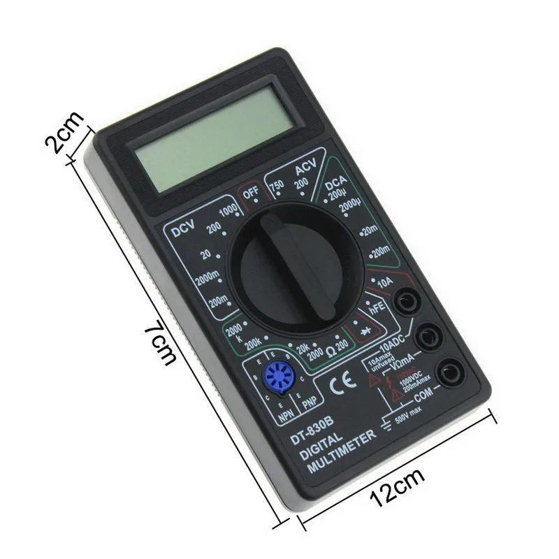 DCV: 200m-2-20-200-600V ± 0.5%ACV: 200-600V ± 1,0%DCA: 2m-20m-200m-10A ± 1.8%Ом: 200-2K-20K-200K-2MΩ ± 1.0%Батарея Тесты: 1,5 VДиодный Тест: ДаНепрерывный зуммер: ДаТест транзистора: ДаХранение данных: ДаЗадний светильник: ДаМощность: аккумулятор 9 вРазмер: 140x70x35 мм