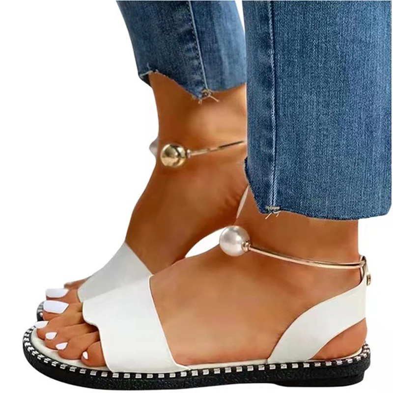 Сандалии женские из экокожи, пляжные удобные босоножки на плоской подошве, с жемчугом, пикантные открытые тапочки, черные, белые, лето 2021