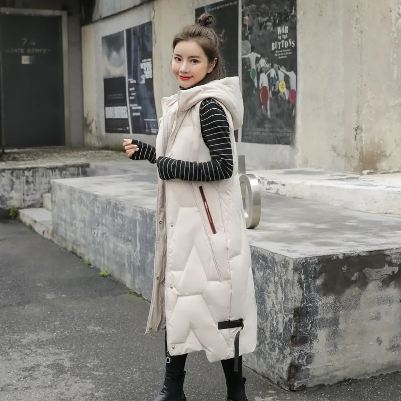 Зимний Длинный жилет, Женская однотонная куртка с капюшоном и карманами на молнии с подкладкой, женская повседневная куртка без рукавов, теплый стеганый жилет для женщин