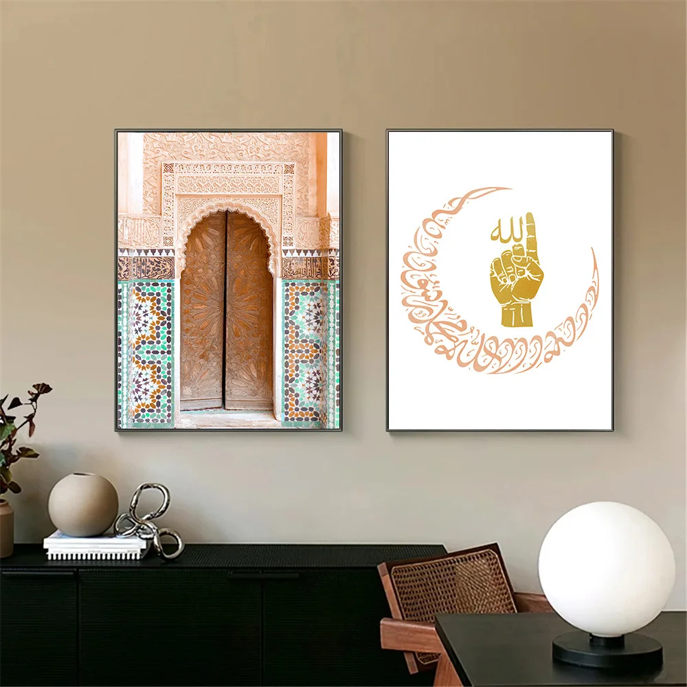 Винтажный настенный плакат с мусульманской архитектурой, настенный постер на холсте с изображением дверей мечети, цветов, арабская каллиграфия, художественный принт, домашний декор