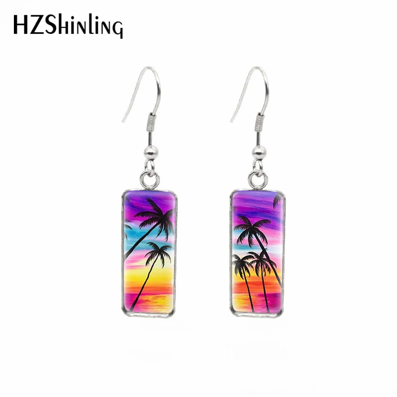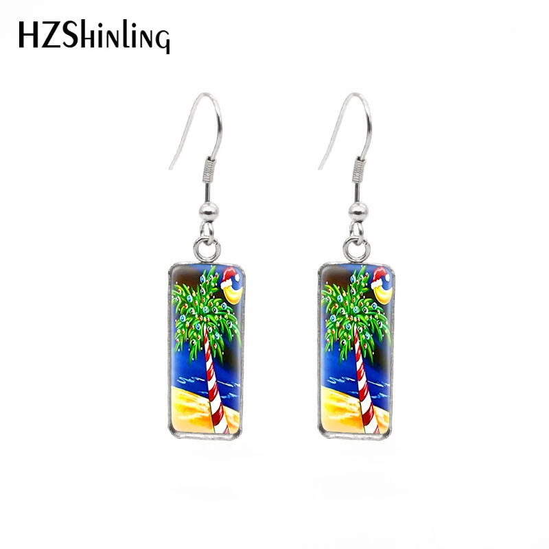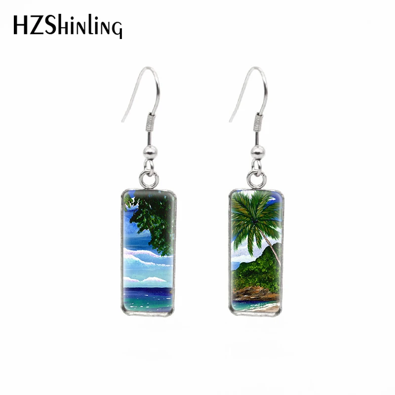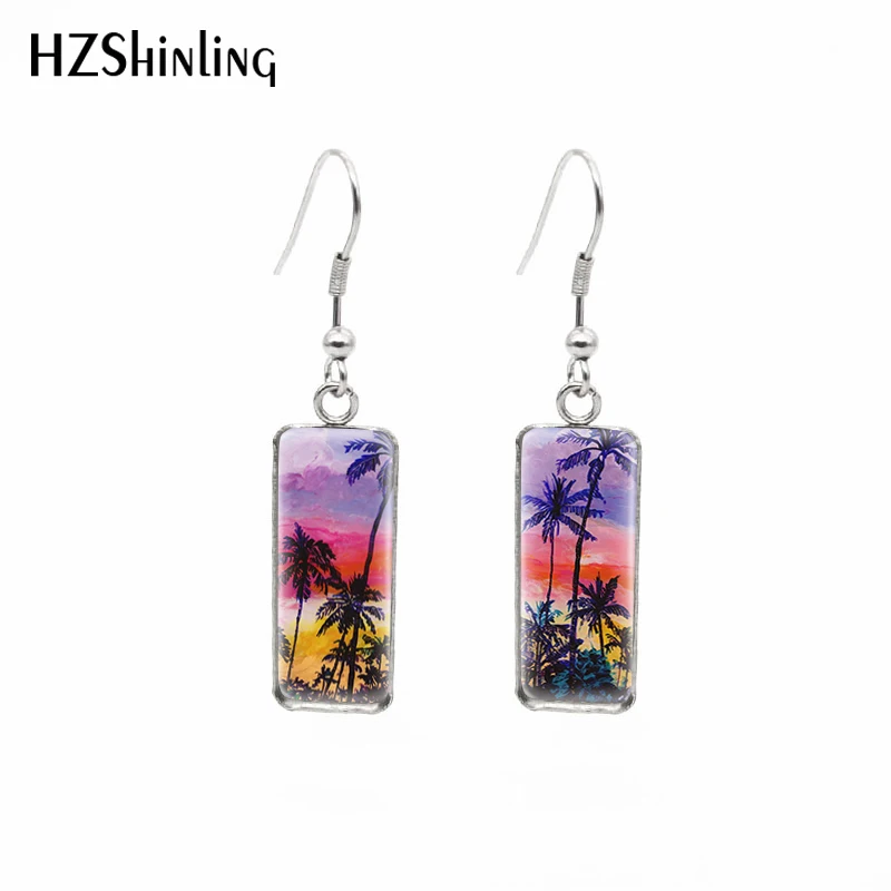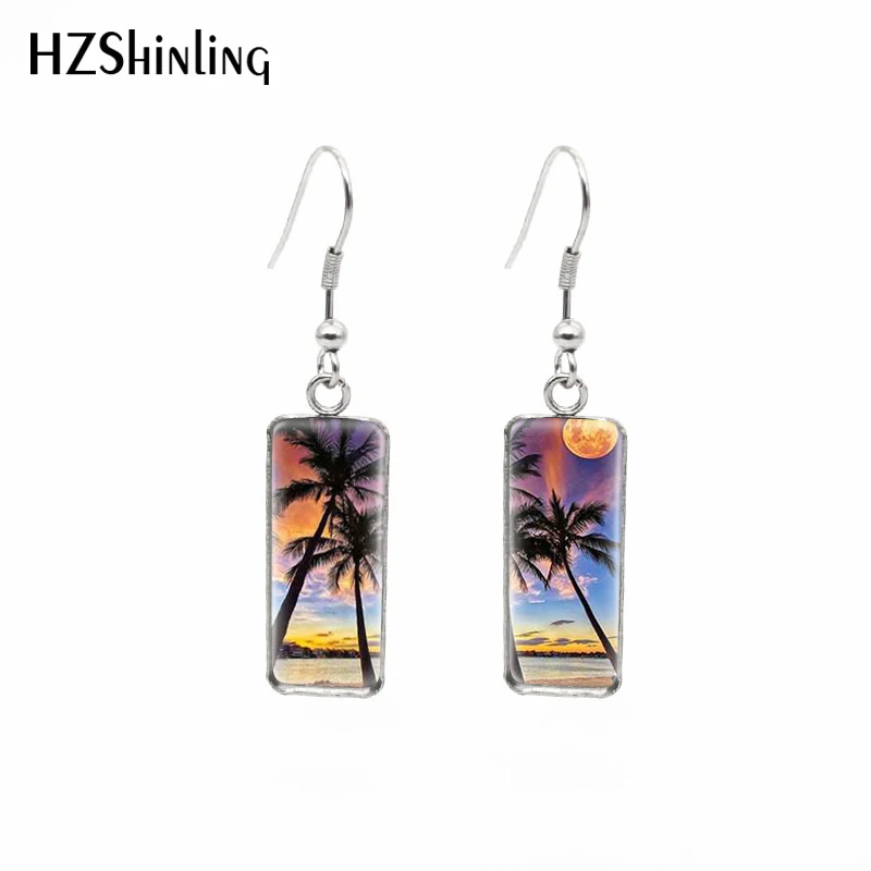 Новинка 2021, прямоугольные серьги в виде кокосового дерева, серьги-Крючки с тропическим искусством и фотографией, стеклянный кабошон, ювелирные изделия ручной работы