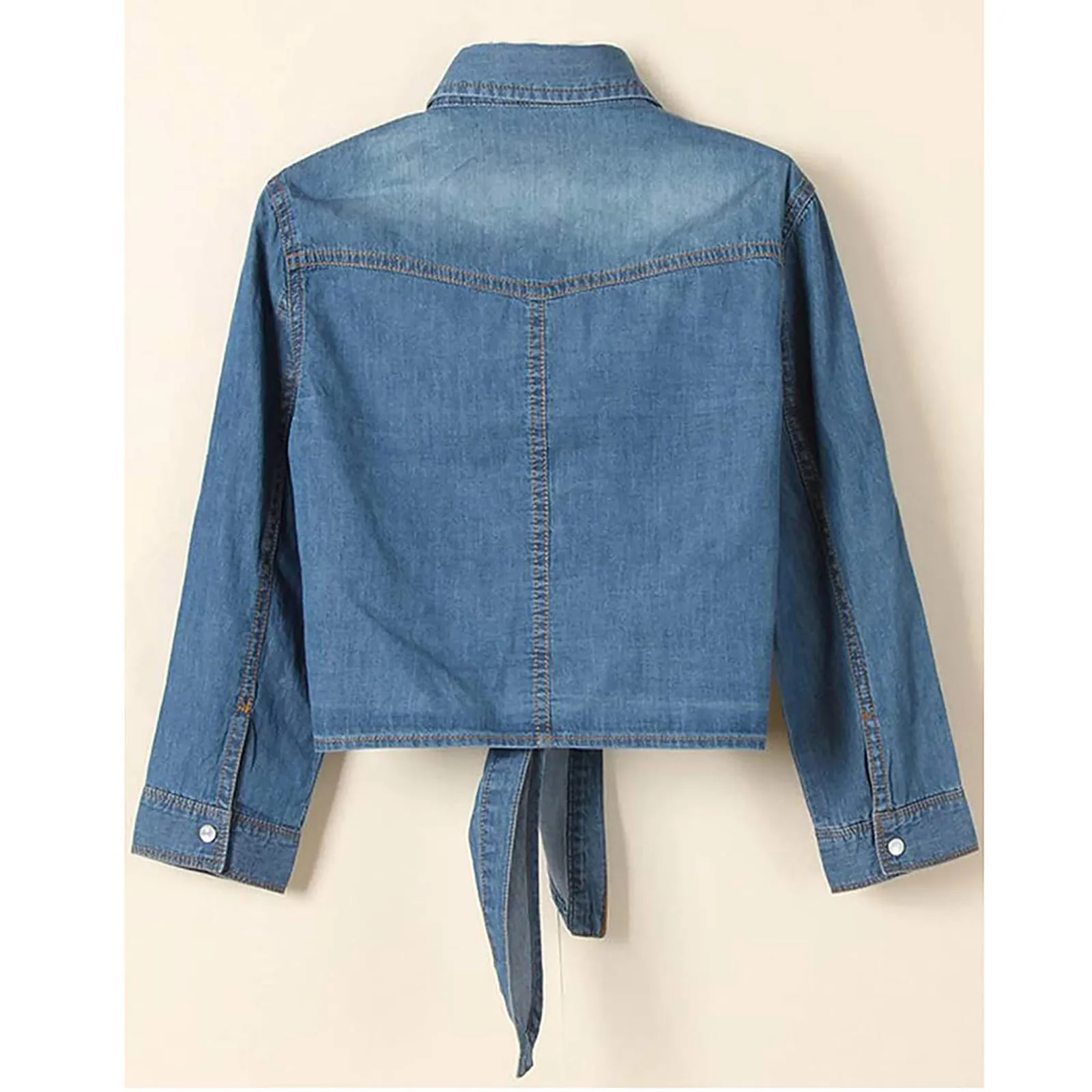 Женский Повседневный укороченный джинсовый топ на пуговицах с рукавом 3/4, джинсовая рубашка с галстуком-бабочкой