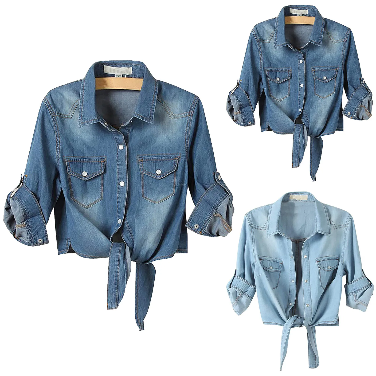 Женская джинсовая куртка, Женская ковбойская рубашка с узлом, Повседневная укороченная джинсовая куртка на пуговицах с рукавом 34, Женский верхний топ, джинсовая куртка
