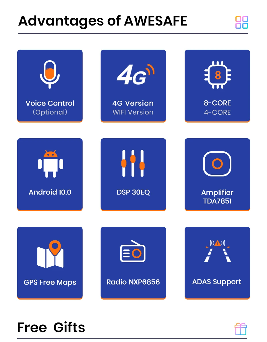 > Основные функции: Android 10,0 + 9 дюймов IPS Экран + 4 ядра 1,2 ГГц + DDR3 1 ГБ флэш-памяти (2 Гб опционально) + 16 Гб памяти (32 Гб опционально) + управление рулевым колесом + RDS/DSP (опционально) + Поддержка оригинального usb-разъема> Специальные функции:1. Штифт-штифт: Кабель питания AWESAFE radio' является штифтом для штифта, прост в установке;2. Встроенный Carplay: Поддержка версии только 2 ГБ + 32 ГБ, просто подключите кабель телефона, стабильный и простой в использовании;3. Цветные кнопки: Поддержка версии только 2 ГБ + 32 Гб;4.Android Auto: 2 Гб + 32 ГБ версия уже активирована/1 Гб + 16 ГБ версия должна связаться с нами для активации;5.Spilt экран: только 1 Гб + 16 Гб Поддержка версии.Дополнительные аксессуары> Голосовое управление AI: Поддержка версии PRO, просто скажите, что командное слово управляется радио без рук, сделайте привод более безопасным;> ADAS DVR, контроль давления в шинах, OBD2, внешний микрофон, кабель RCA;> OSD языкРусский, английский, испанский, итальянский, французский, чешский, арабский, немецкий, иврит, китайский, эстонский, польский, филиппинский, финский, корейский, голландский, хорватский, латышский, литовский, румынский, норвежский, португальский, японский, шведский, тайский, турецкий, украинский, венгерский, словацкий, датский, словенский.Отличное обслуживание клиентовВ AWESAFE Наша цель-продолжать усердно работать, чтобы сделать инновационное оборудование и программное обеспечение автомобильного мультимедийного плеера радио, чтобы дать вам этот индивидуальный опыт.Мы предоставляем обновления для прошивки, программного обеспечения, gps-навигационных карт бесплатно.
