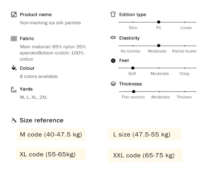 ОписаниеНазвание: женские бесшовные трусикиМатериал: хлопок/полиэстерВес: 30 гРазмер: M (подходит для 40-48 кг)L (подходит для 48-55 кг)XL (подходит для 55-65 кг)XXL (подходит для 65-75 кг)Функция: быстро сохнет/дышащий/легкий/водонепроницаемыйОсобенность:1. Женские хлопковые трусики с приподнятием бедер, эластичный пояс, мягкие, гладкие и приятные для кожи;2. Дизайн с широкими штанинами идеально подойдет для ваших очаровательных изгибов.3. Высокая эластичность не связана, многократные испытания на эластичность, нелегко деформировать при натяженииПримечание:1. Обратите внимание, что разница светильник цвете s возможна из-за освещения и экрана;2. Из-за измерения вручную возможна погрешность в 1-3 см;