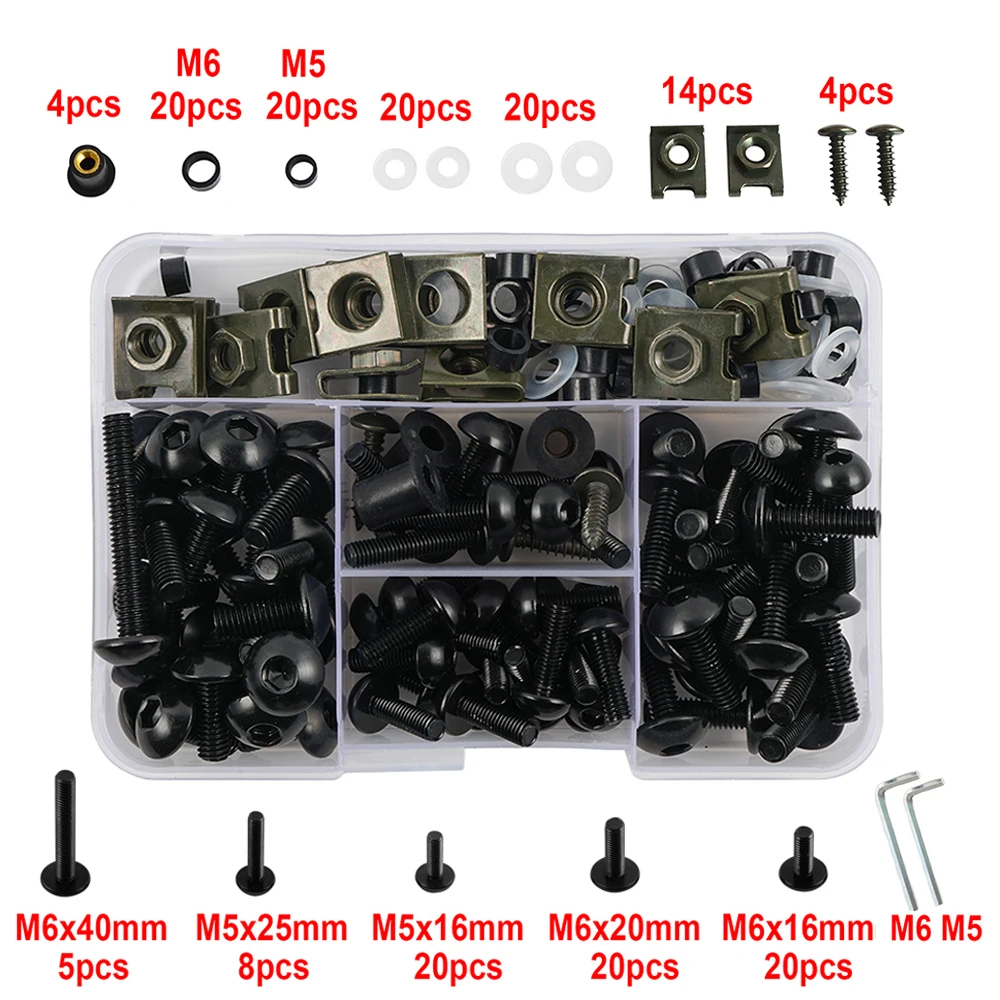 Посылка включает в себя:(С пластиковой коробкой)Всего: 177 шт.Болты M6 (6x40 мм) x 5Болты M6 (6x16 мм) x 20Болты M6 (6x20 мм) x 20Болты M5 (5x16 мм) x 20Болты M5 (5x25 мм) x 8Балочная установка для винтов (4,8*20 мм) x 4Зажимы скорости x 14Мойки M6 x 20Мойки M5 x 20M6 пластиковая стойка x 20M5 пластиковая стойка x 20Гайка колодца x 4Гаечный ключ x 2