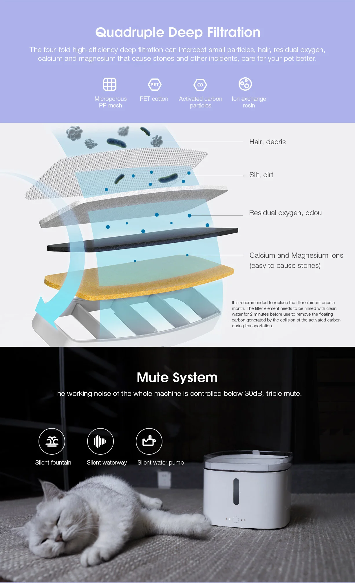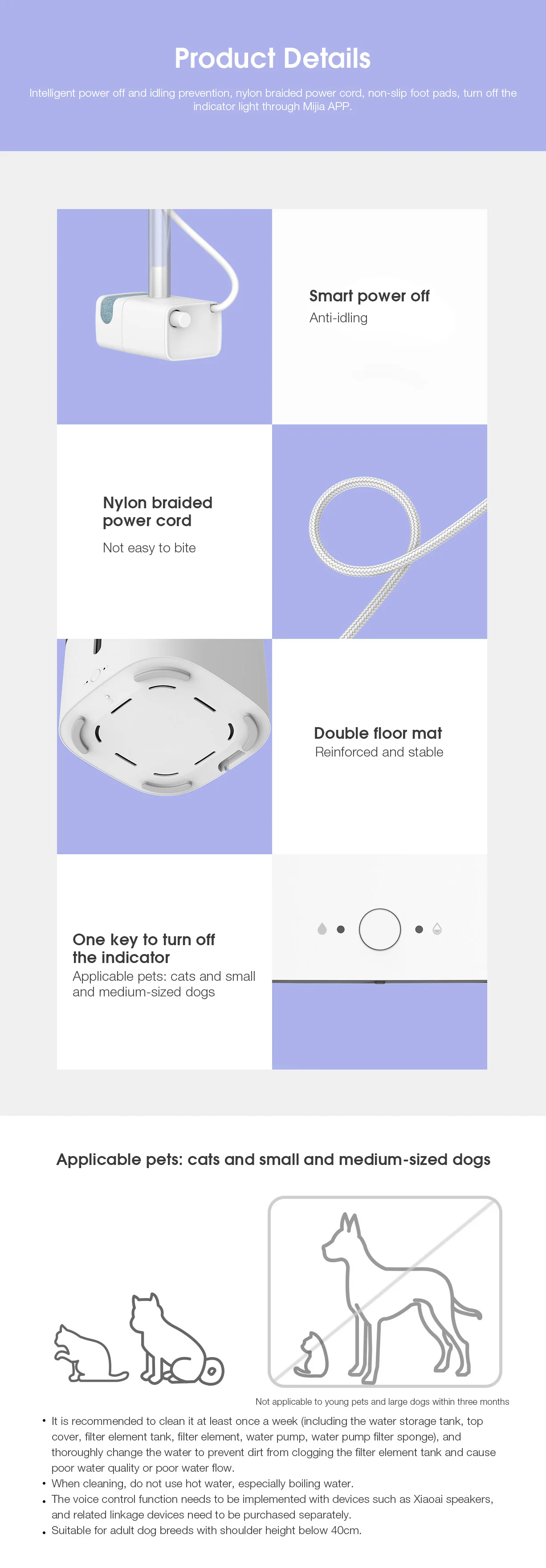 1. Рекомендуется чистить не реже одного раза в неделю (включая резервуар для хранения воды, верхнюю крышку, резервуар для фильтрующих элементов, фильтрующий элемент, водяной насос и губку для фильтра водяного насоса) И тщательно изменить воду для предотвращения аномальных явлений, таких как плохое качество воды или плохое качество воды, вызванное блокировкой грязи фильтрующий элемент бака.2. При очистке не используйте горячую воду, особенно кипяток.3. Температура Высокая весной и летом. Пожалуйста, очистите резервуар для воды, верхнюю крышку, фильтрующий элемент, губку фильтра водяного насоса, водяной насос и другие компоненты, чтобы избежать размножения комаров.4. Рабочий шум всей машины составляет менее 30 дБ.5. Функция голосового управления должна быть реализована с динамиком Xiaoai и другим оборудованием, и соответствующее оборудование связи должны быть приобретены отдельно.6. Согласно данным тестирования, ежедневное потребление воды для взрослых кошек весом 5 кг составляет около 200 мл, а совокупное потребление питьевой воды в течение 7 дней составляет около 1400 мл. В процессе фактического использования могут быть ошибки из-за изменения объективной среды или различных типов, возраста, здоровья и привычек поведения домашних животных.7. Подходит для взрослых собак с высотой плеч менее 40 см. 8.если нет специального описания, данные на этой странице представлены в лаборатории кошек и собак. Из-за различных объективных условий данные тестирования будут иметь различные отклонения.