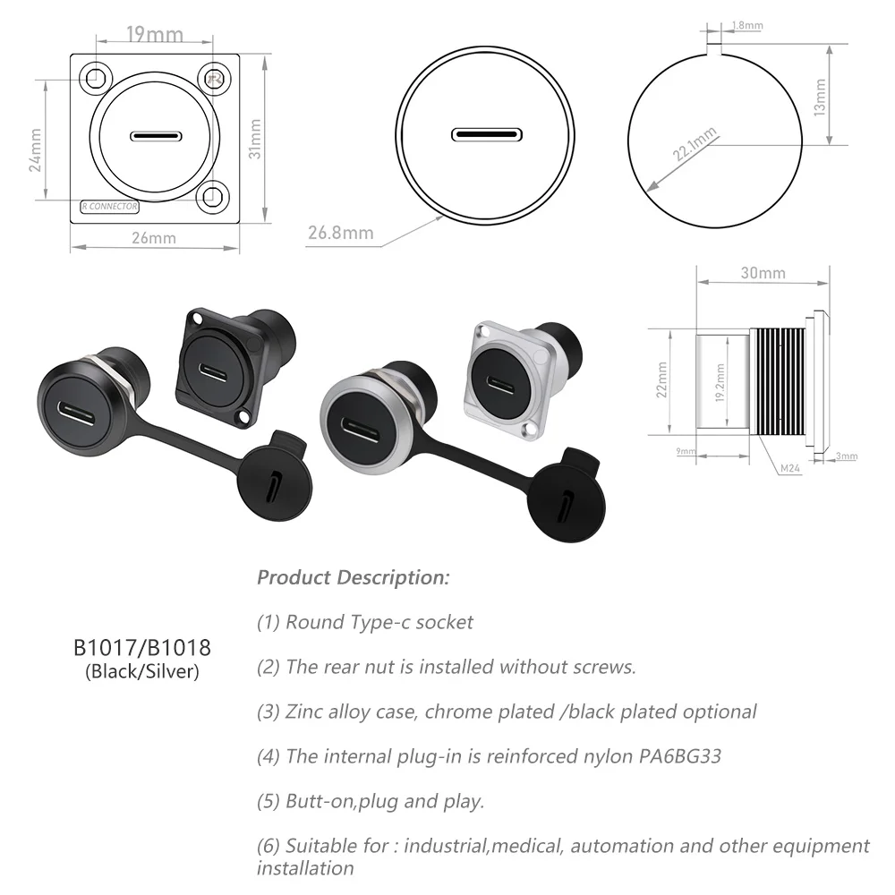 Монтажный круглый разъем Type-C для панели, 1 шт., переходник Type-c, разъем для самостоятельной сборки для автоматизации