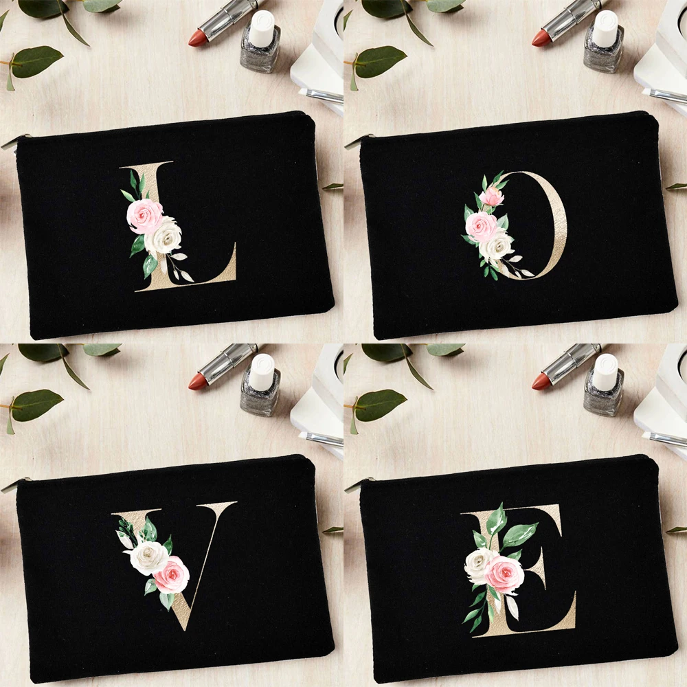 Модные розовые женские косметички с алфавитом роз, черная повседневная женская сумка для помады, дорожная портативная многоразовая Холщовая Сумка
