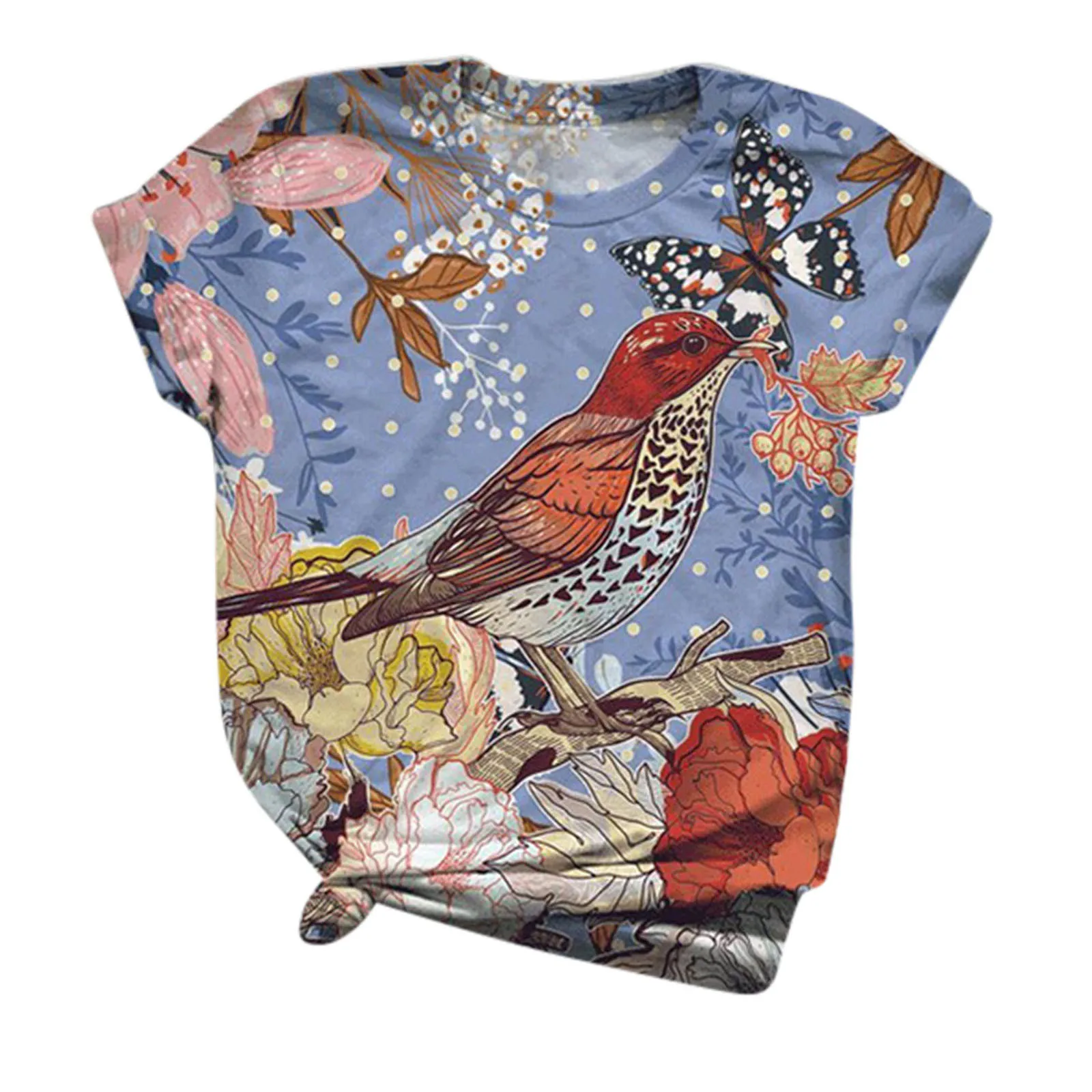 Женские футболки в стиле Харадзюку, летние женские футболки с коротким рукавом и принтом птиц, топы с круглым вырезом, футболка, женские футболки