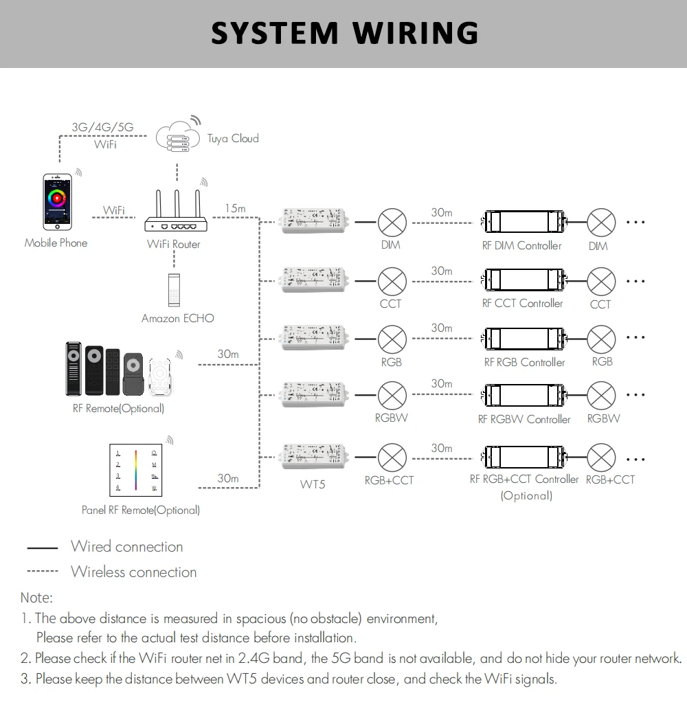 WT5 работает в качестве WiFi-RF преобразователя для соответствия RF светодиодный контроллер или Диммируемый драйвер: