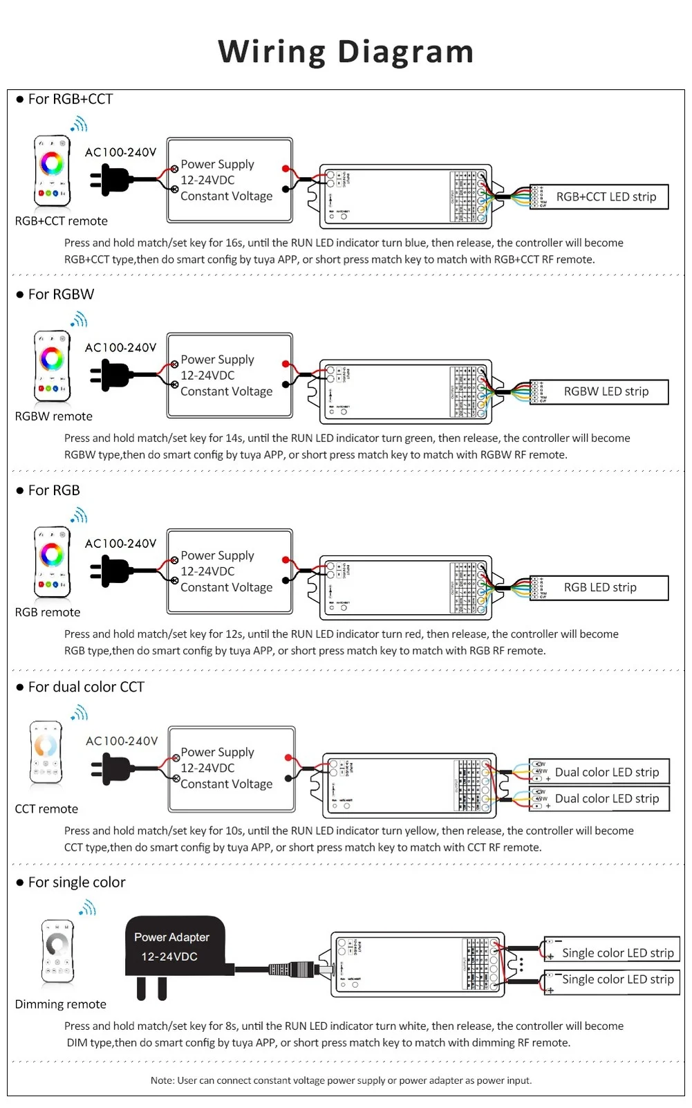 Он используется для 5 видов различных светодиодных лент-светильник,-Одноцветный, CCT, RGB, RGBW, RGBCCT светодиодный ленточный светильник.Перед использованием, пожалуйста, убедитесь в том, что ваш светодиодный светильник соответствует вашей модели. Так что светодиодный индикатор может работать должным образом.