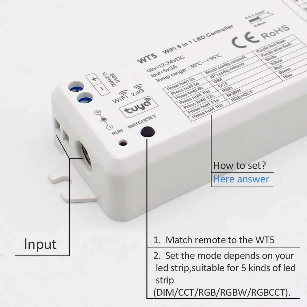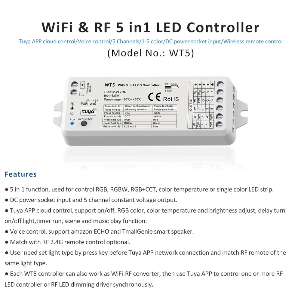 Модель: MJJCLED-WT5Tuya APP Облачное управление/Голосовое управление/5 каналов/1-5 цветов/DC входное гнездо питания/беспроводной пульт дистанционного управления
