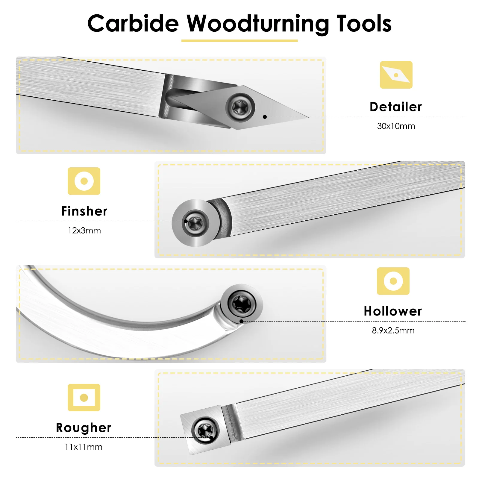 4. Простота в использовании-очень упрощенное обучение путем поворота, без сложного угла обучения и запоминания, для всех уровней навыков, деревообработки или DIY энтузиастов. Независимо от того, новичок вы или опытный Тернер, вы получите отличные результаты от наших твердосплавных инструментов.