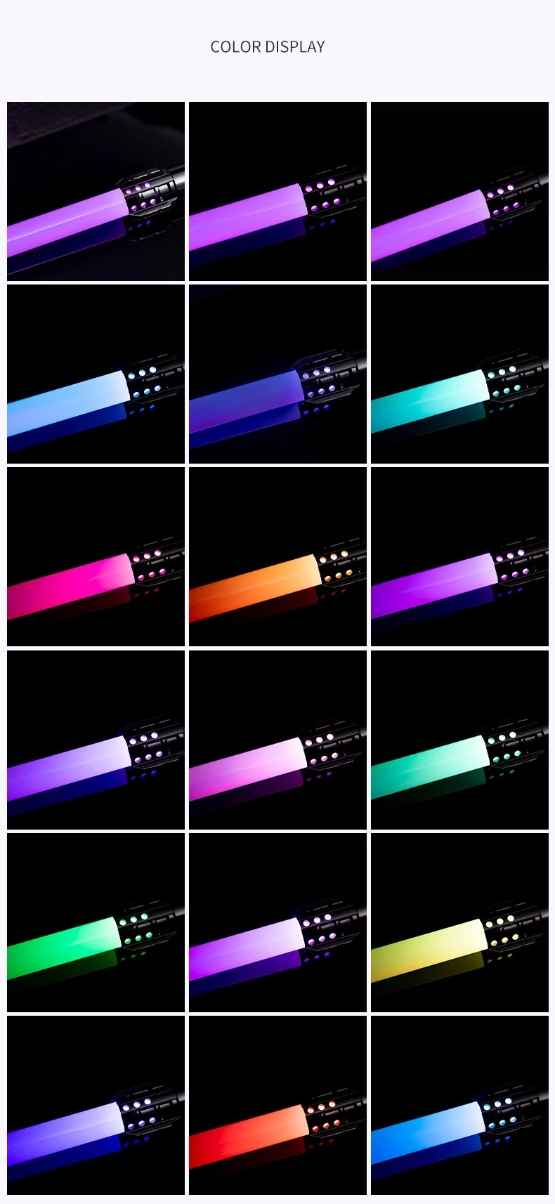 Цветная (RGB) изменение цвета 15 видов высокого качества светильник цвета + неограниченное изменение цвета: светильник сабля имеет 15 видов светильник цвета: красный, оранжевый, желтый, зеленый, черный, зеленый, синий, фиолетовый, холодный белый, небесно-голубой, голубой, розовый и т. Д. И другой светильник можно отрегулировать на тысячи видов.