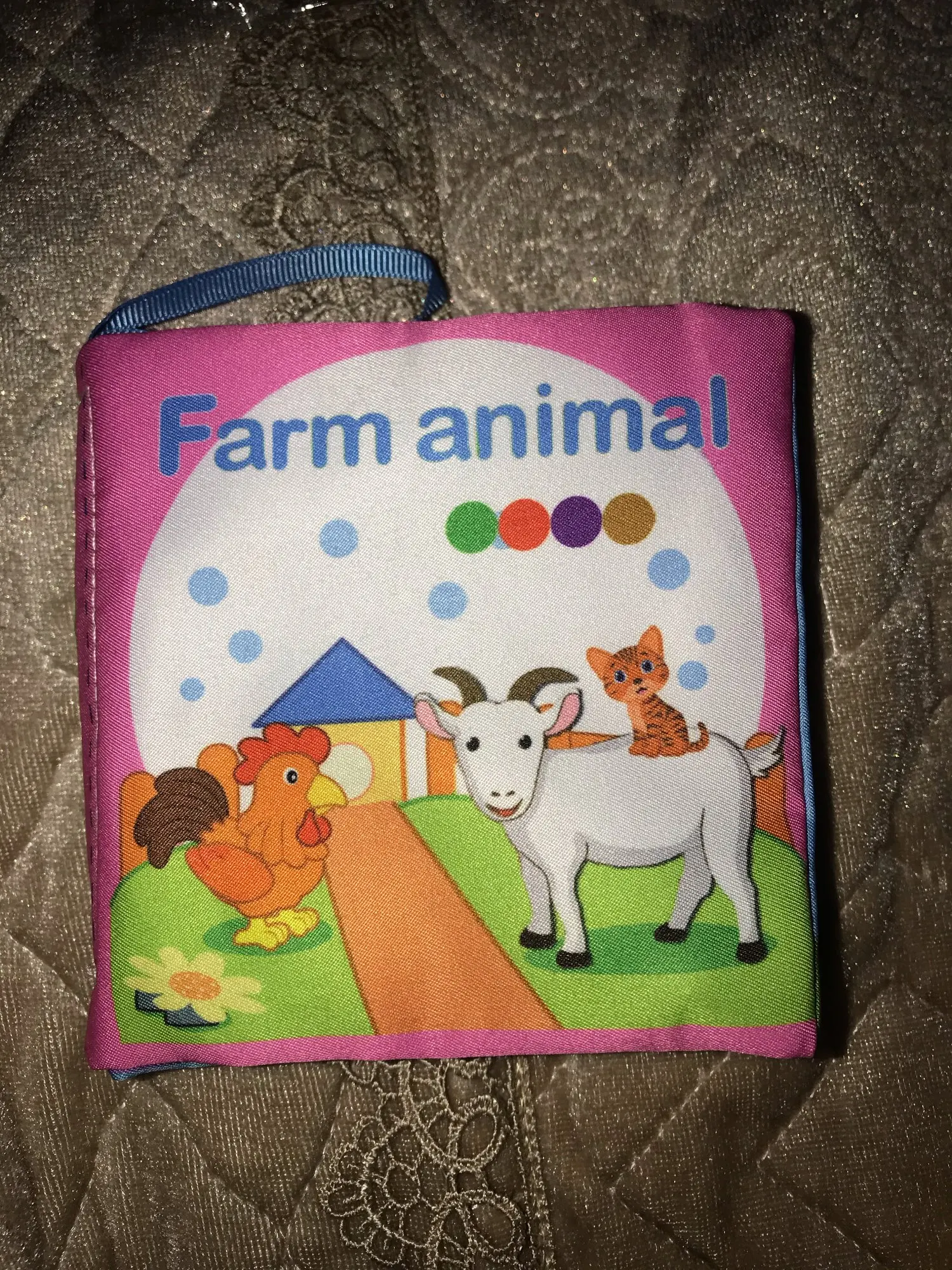 Небольшая мягкая книжка, шуршит, без пищалки. Красочные животные. Стоит своих денег.
