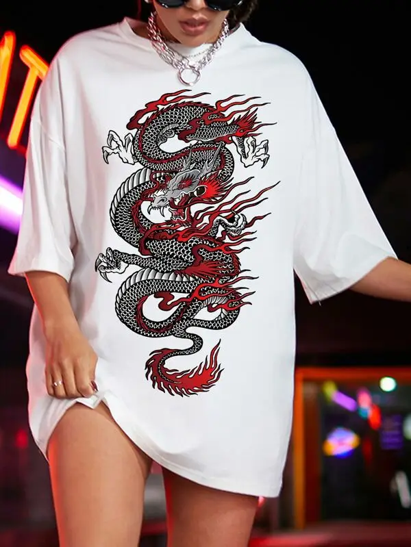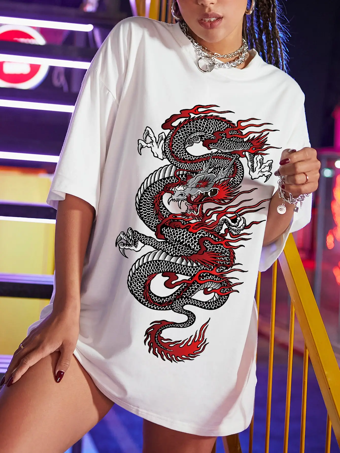 Футболка женская оверсайз с принтом дракона, топ с коротким рукавом в стиле Харадзюку, уличная одежда, на лето