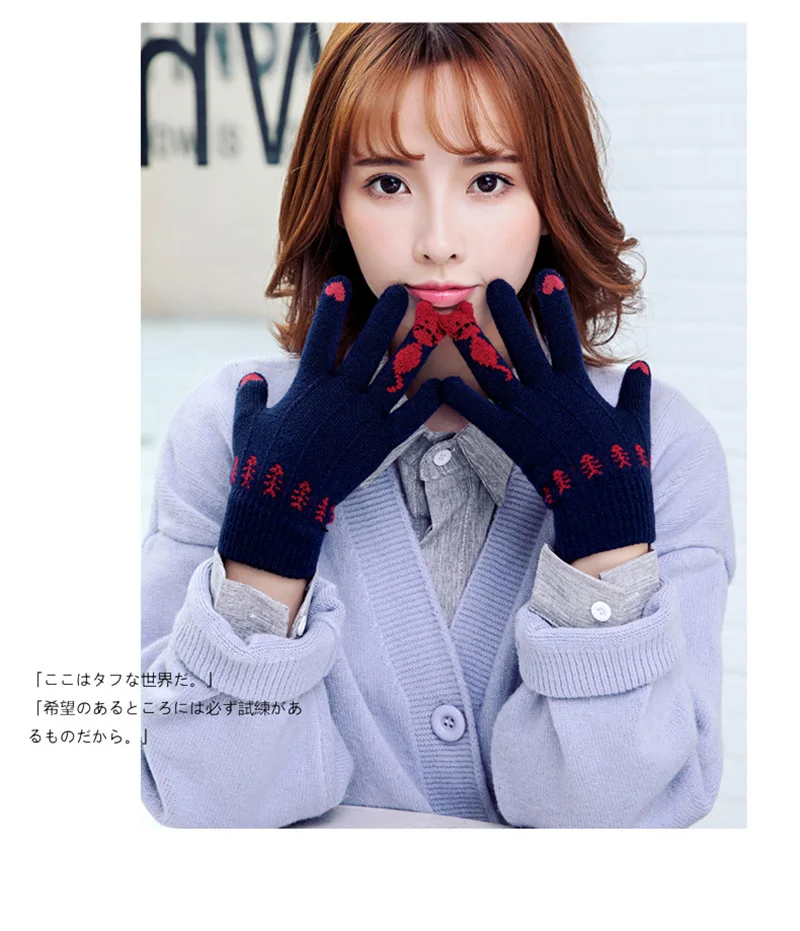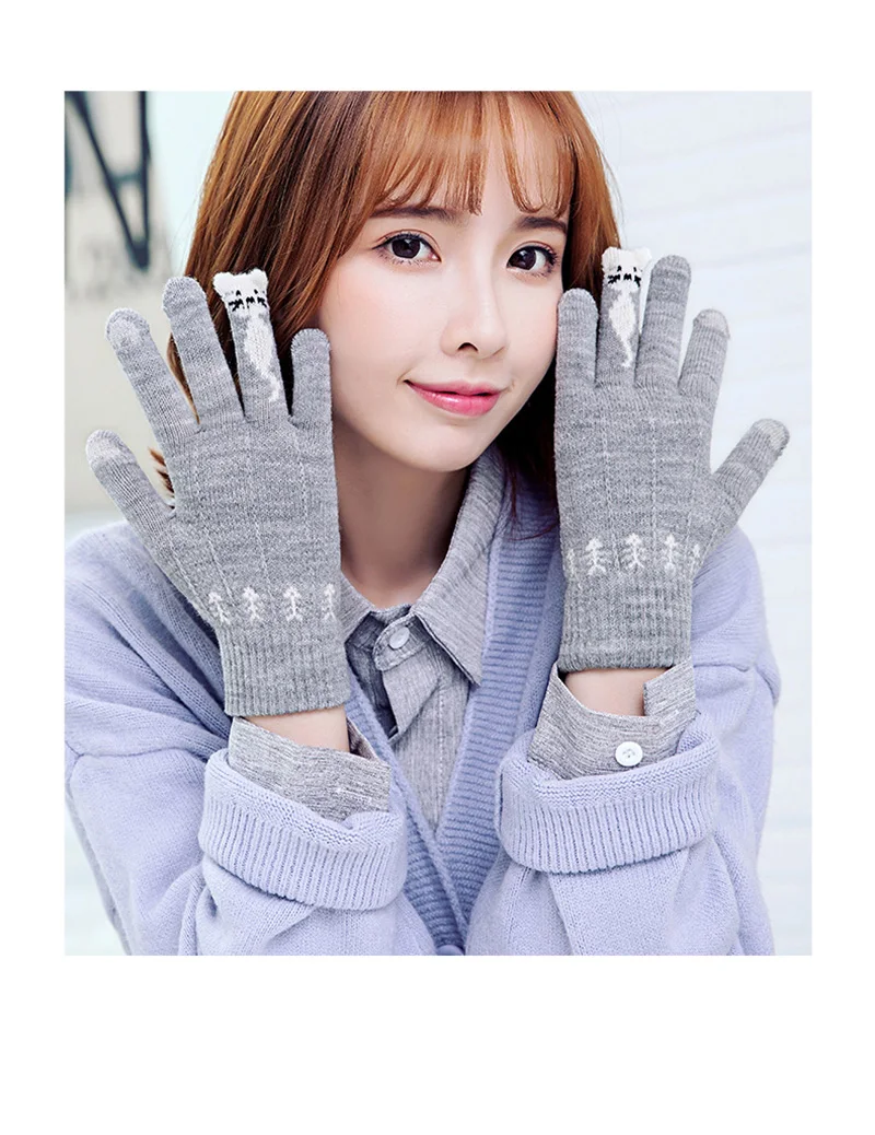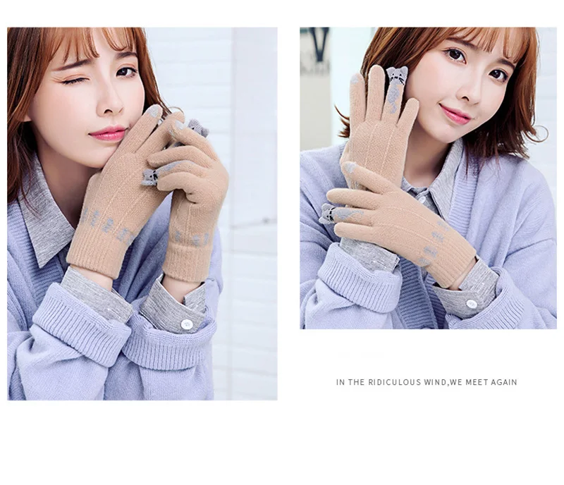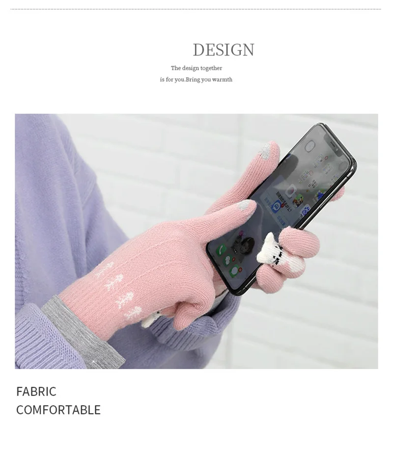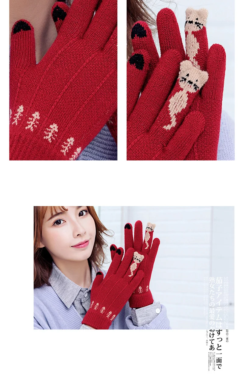 Зимние женские теплые эластичные вязаные перчатки для сенсорного экрана, Женские Жаккардовые, с мультипликационным котом, плюшевые, плотные, двухслойные, для вождения I93