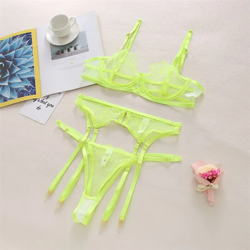 Женское Эротическое нижнее белье, комплект из 3 предметов, прозрачный бюстгальтер на тонких бретельках с вышивкой и V-образным вырезом + стринги + пояс, подвязки, прозрачный костюм для сна