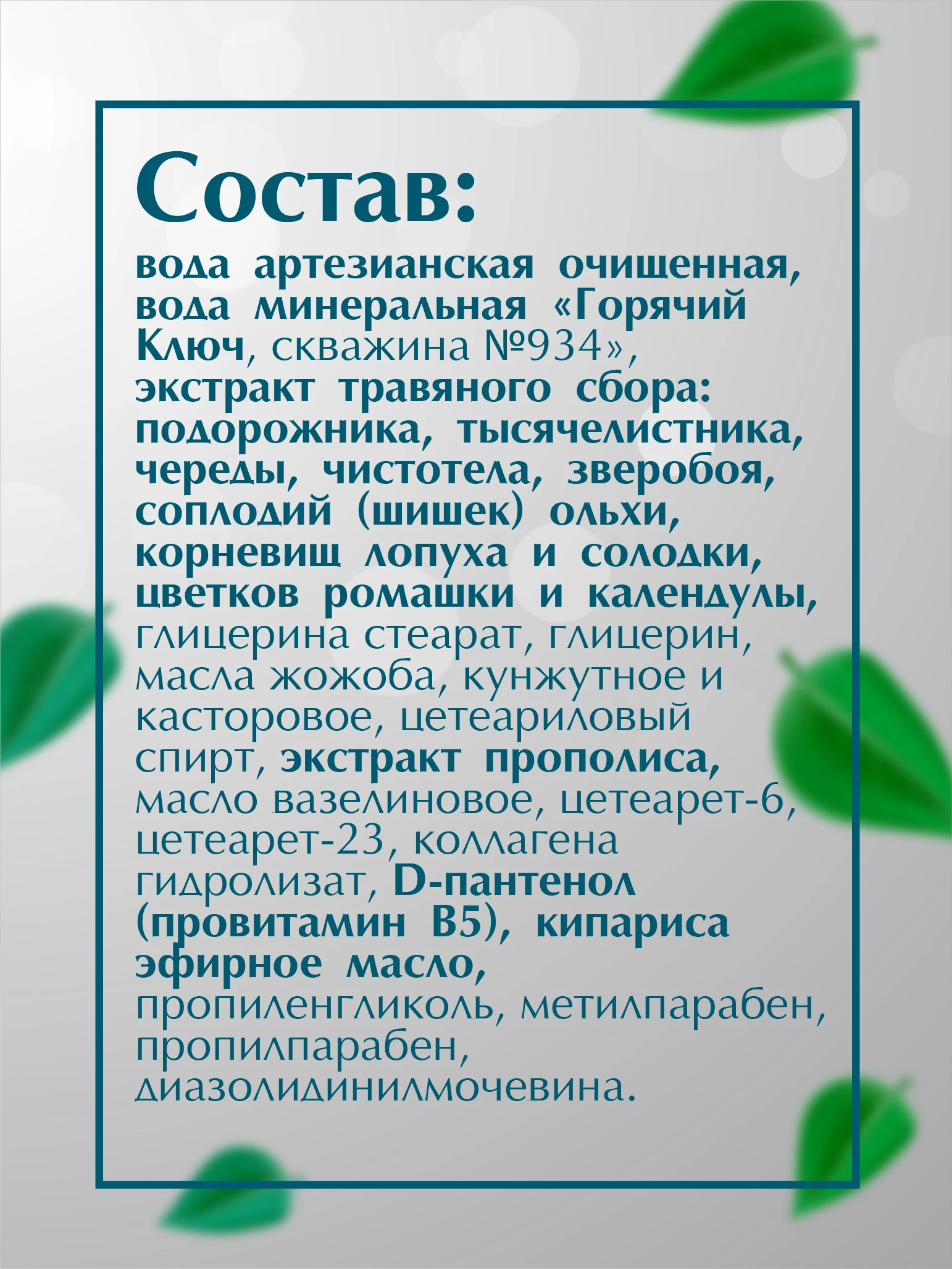 Состав:вода артезианская очищенная, водаминеральная «Горячий Ключ, скважина№934», экстракт травяного сбора:подорожника, тысячелистника, череды,чистотела, зверобоя, соплодий (шишек)ольхи, корневищ лопуха и солодки, цветковромашки и календулы,глицеринастеарат, глицерин, масла жожоба, кунжутноеи касторовое, цетеариловый спирт,экстракт прополиса, масло вазелиновое,цетеарет-6, цетеарет-23, коллагенагидролизат,D-пантенол(провитамин В5), кипариса эфирное масло,пропиленгликоль, метилпарабен,пропилпарабен, диазолидинилмочевина.