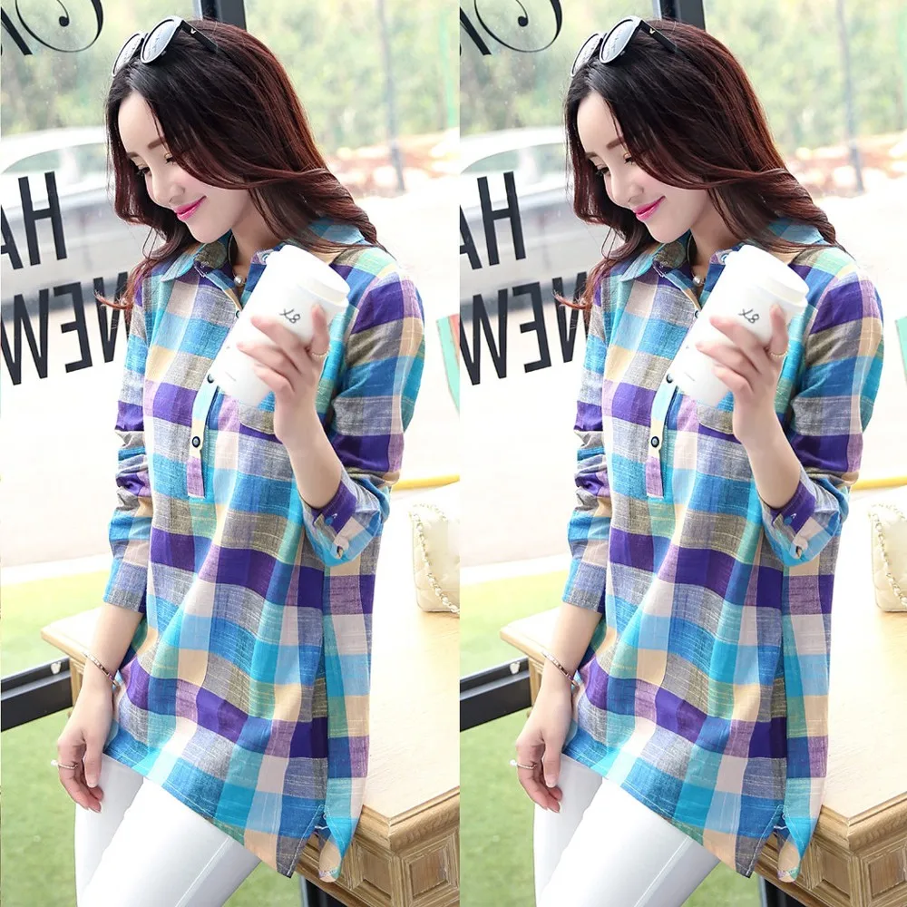 Женская Повседневная Свободная клетчатая блузка с длинными рукавами и пуговицами