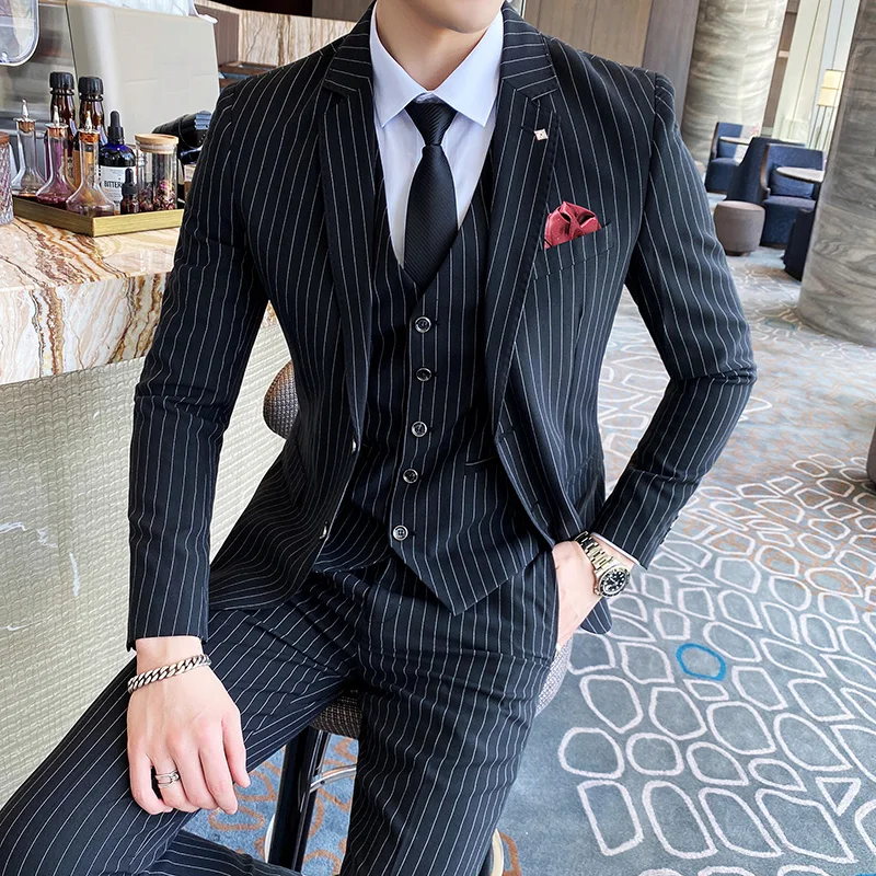 (Пиджак + жилет + брюки), роскошный модный мужской деловой костюм в полоску, повседневный деловой костюм, высококачественный деловой костюм, комплект из 3 предметов для жениха, свадьбы