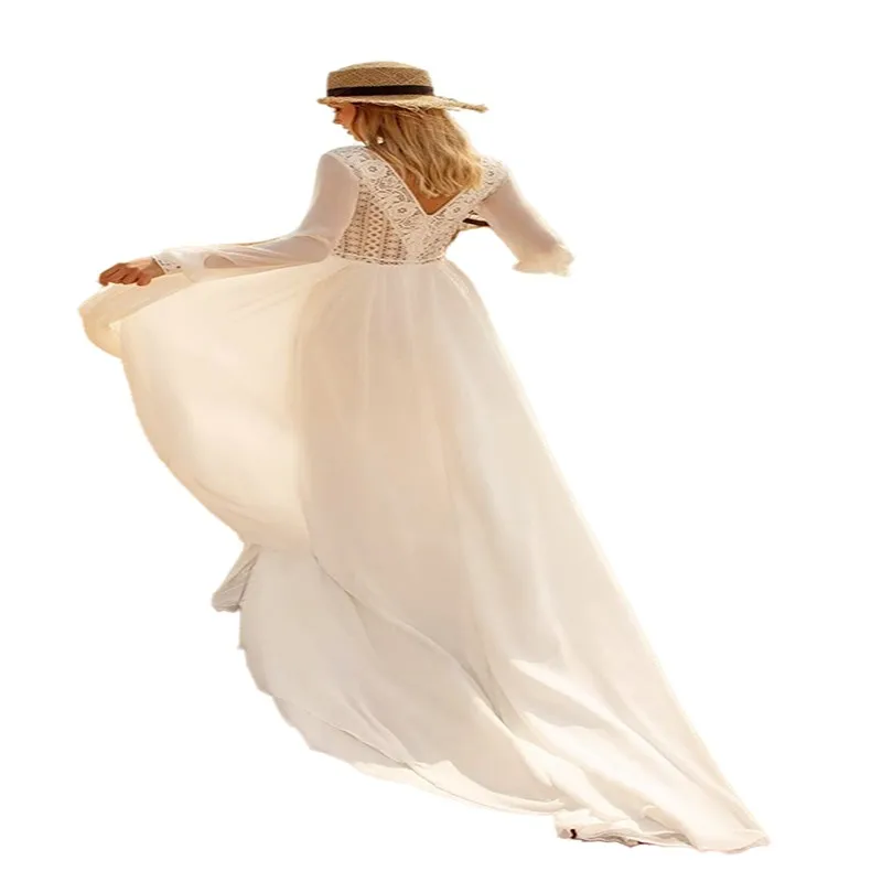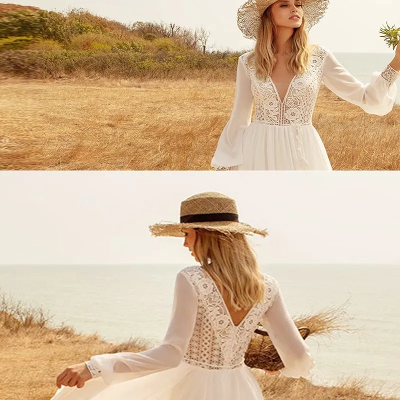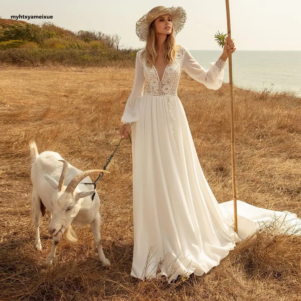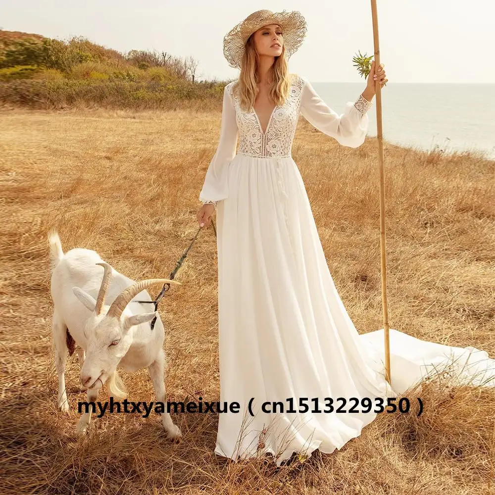 Шифоновое свадебное платье с длинным рукавом, V-образным вырезом и кружевной аппликацией