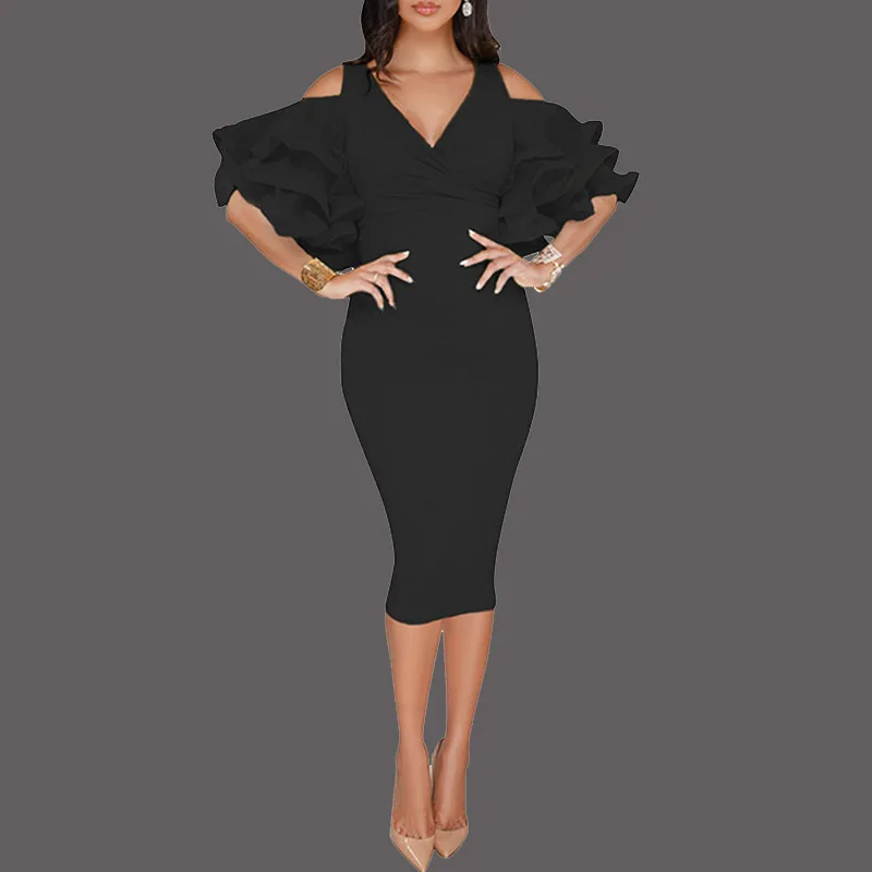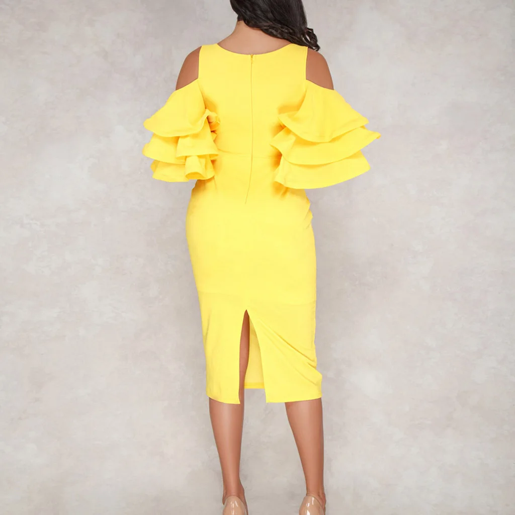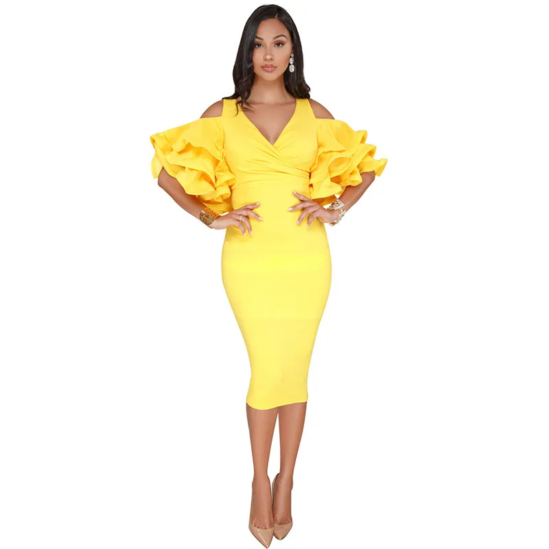 Женское облегающее вечернее платье миди, элегантное офисное платье с открытыми плечами и рукавом в виде листьев лотоса, желтое, розовое, черное платье для вечеринки, лето 2021