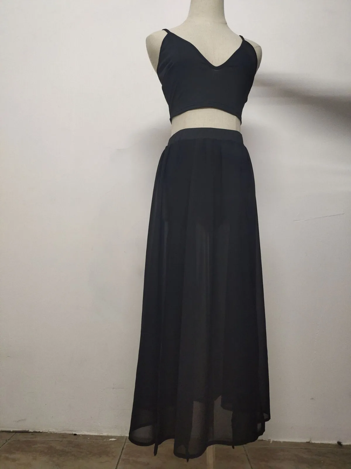 Женский праздничный костюм в стиле бохо, модная однотонная пляжная повседневная юбка, укороченный топ и прозрачная Макси-юбка с высоким разрезом, одежда для отдыха, на лето