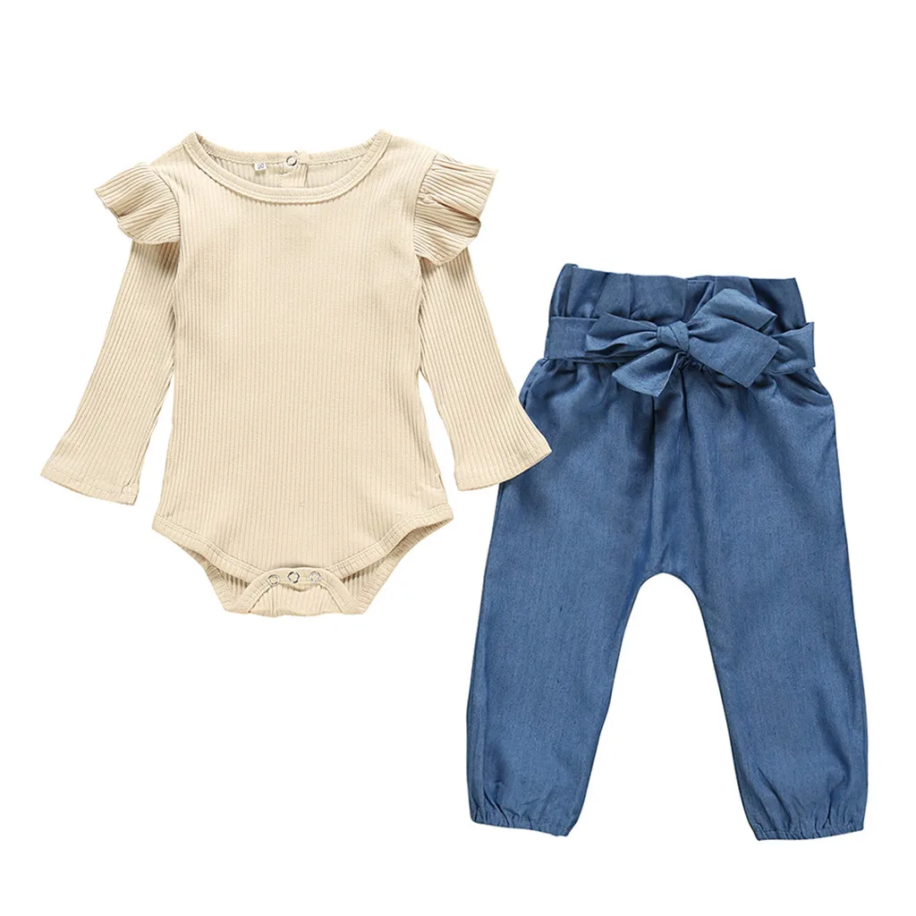 Детские комплекты, новинка 2021, наряды для новорожденных, девочек, однотонный боди с длинным рукавом и джинсовые брюки, комплект из джинсов
