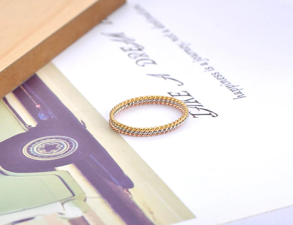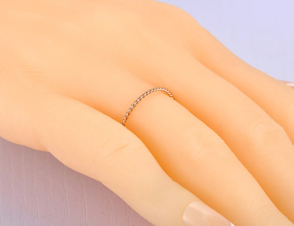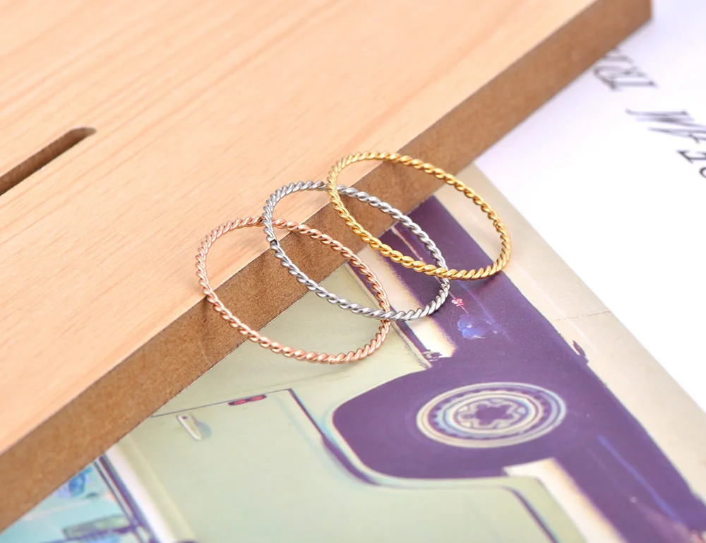 Тоненькие витые колечки разного цвета. Розовое золото - отлично! Золото - виден стык, но тактильно не ощущается, кольцо можно носить. Серебро - стык выполнен отвратительно. Имеется острая ступенька, которая повреждает кожу. Кольцо носить нельзя! Разве что, стык залить эпоксидной смолой, чтобы не царапался.