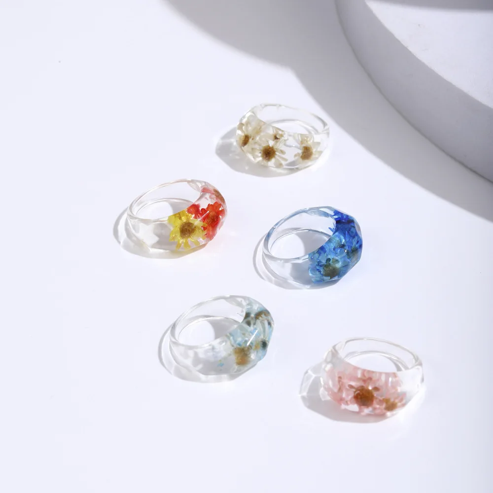Новинка 2021, модное женское свадебное кольцо из смолы с цветами, милое и элегантное кольцо из натуральной серии с растениями, прозрачное синее и розовое кольцо, ювелирные изделия