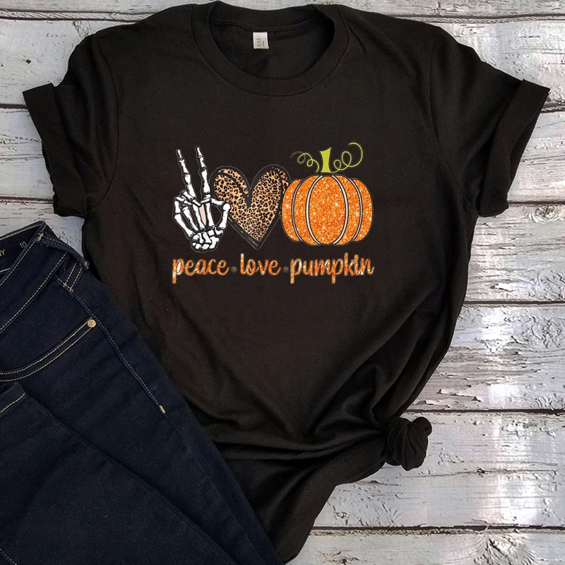 Мир, любовь, яркая футболка, Хэллоуин, тыква, женские футболки, Harajuku, забавный, скелет, графическая футболка, мультфильм