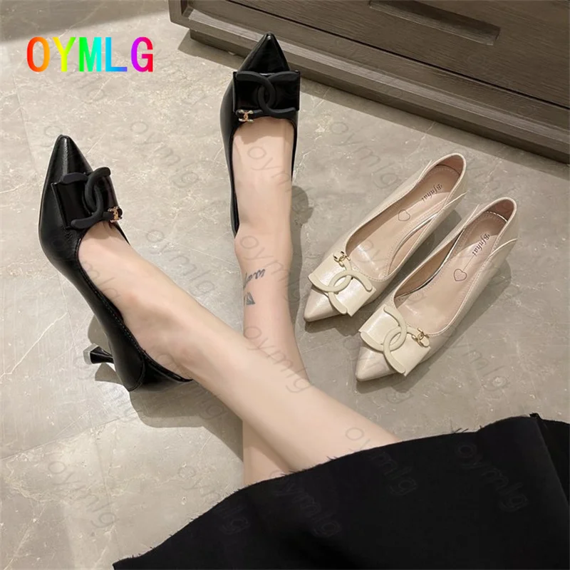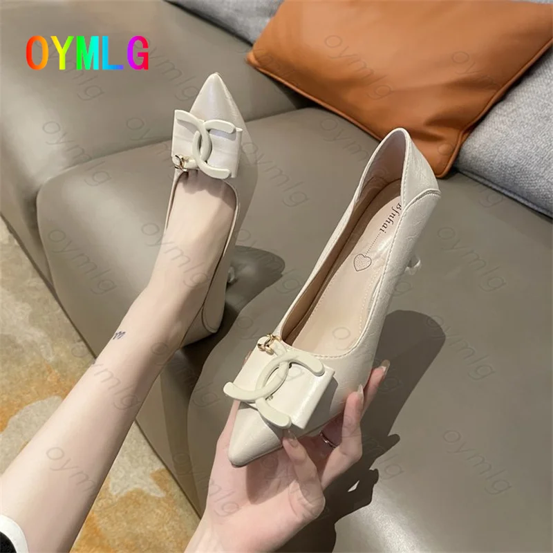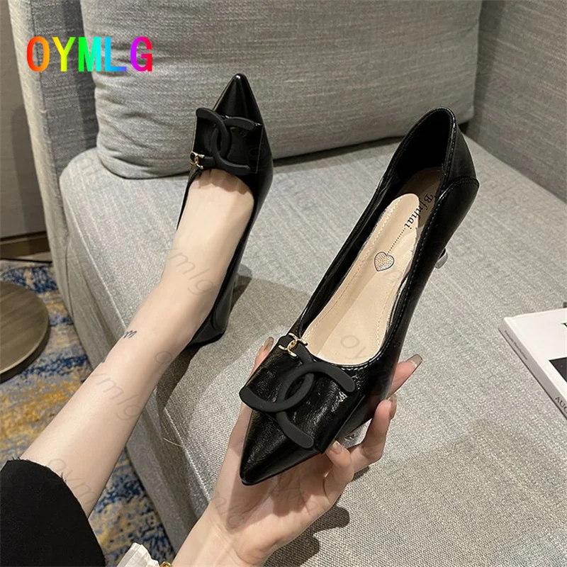 Женские туфли на высоком каблуке, мягкие кожаные туфли с острым носком и металлической пряжкой, лето 2021