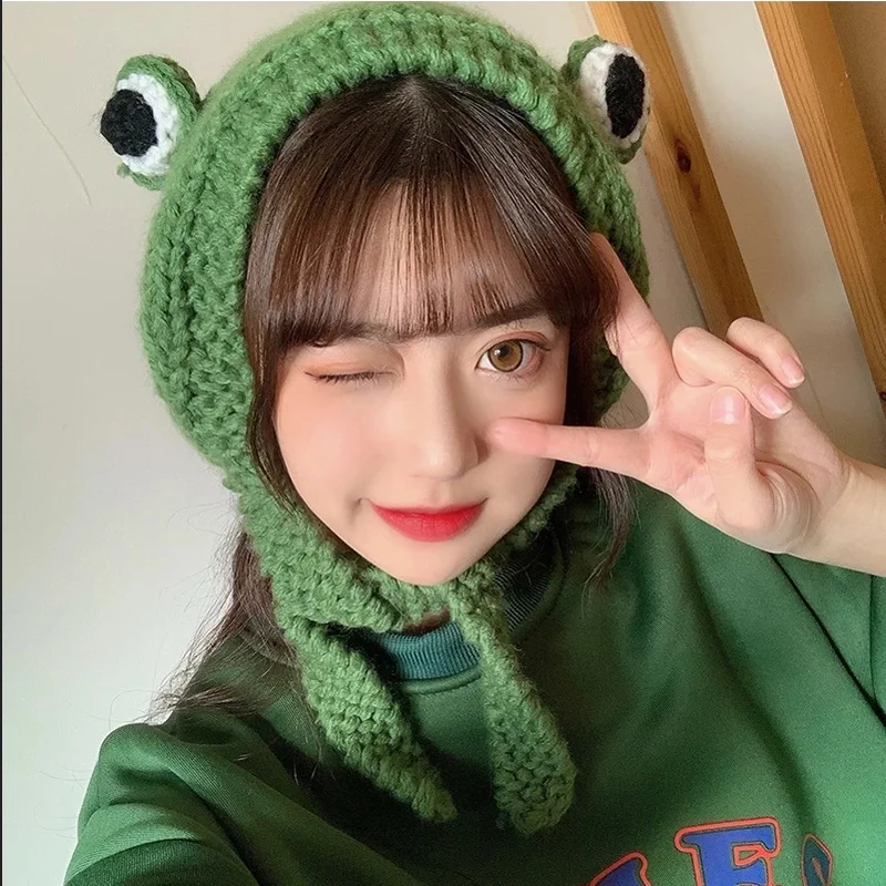 Зеленая лягушка, 3D вязаная шапка, Милая женская шапка для девушек,...