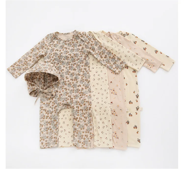 Комбинезоны с длинным рукавом для новорожденных, из органического хлопка, брендовый дизайн для младенцев, мальчиков и девочек, комбинезон с шапочкой и цветочным узором вишни
