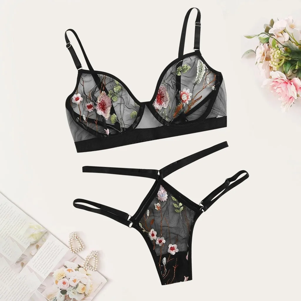 Комплекты с бюстгальтером и трусиками с цветочной вышивкой, сексуал...