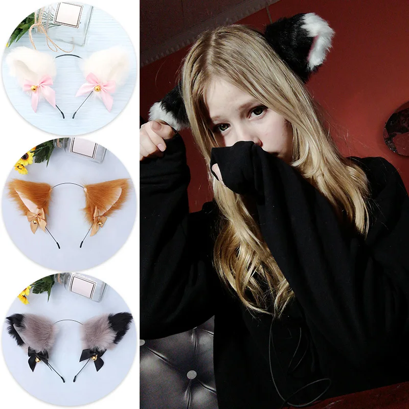 Плюшевые кошачьи ушки лисы Лолита кошачьи уши повязка на голову Хэллоуин обруч для волос милый Косплей Костюм для вечеринки бант Колокольчик для девочек аксессуары для волос
