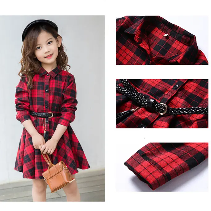 Элегантное повседневное платье-рубашка в клетку с длинными рукавами и поясом для девочек, модные Хлопковые Платья для подростков, размер От 4 до 13 лет