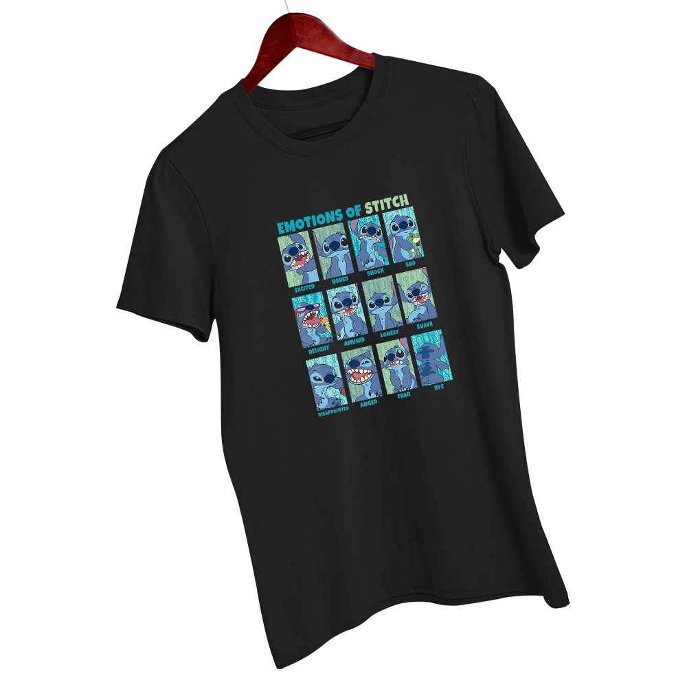 Футболка женская черная с принтом эмоции Стича и эмоции Стича