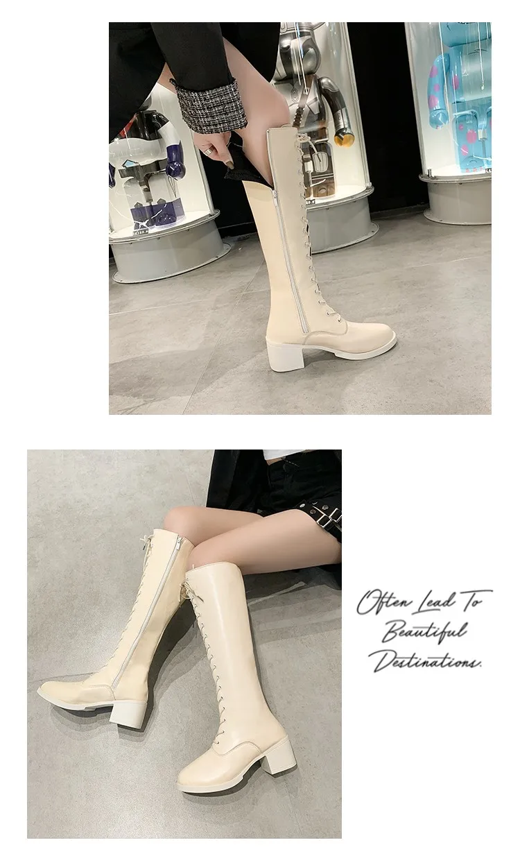 Женские высокие ботинки из ПУ кожи, на шнуровке, до середины икры