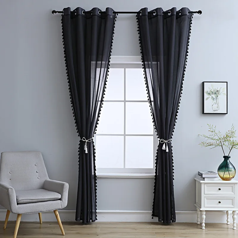 Черные прозрачные шторы с кисточками для гостиной, спальни, льняные...