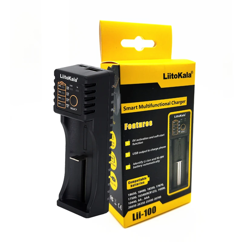 1, Liitokala Lii100 посылка: зарядное устройство Lii100 + USB кабель + 5 В 2 а зарядный разъем + руководство