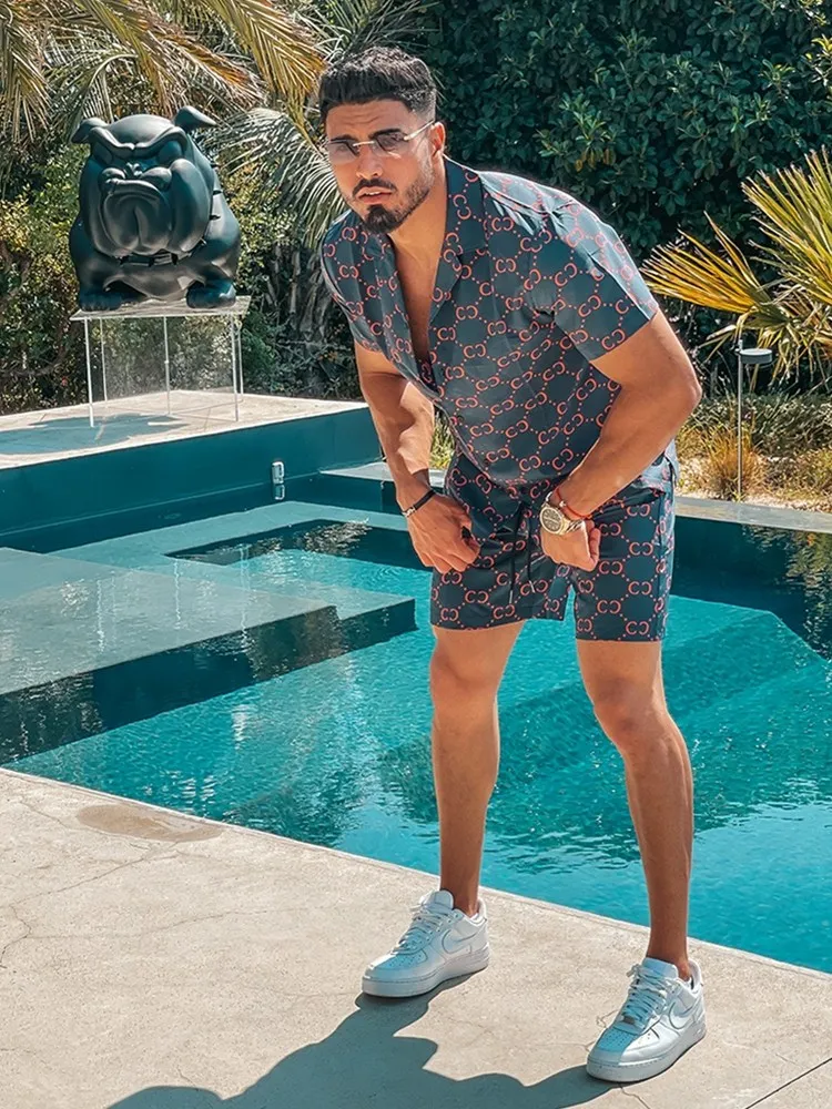 Мужской комплект из 2 предметов, гавайская рубашка с буквенным принтом и короткими рукавами, пляжные шорты, повседневный Быстросохнущий костюм, лето 2021