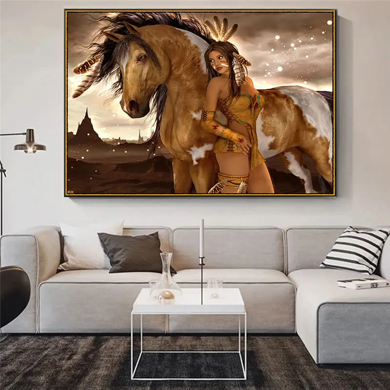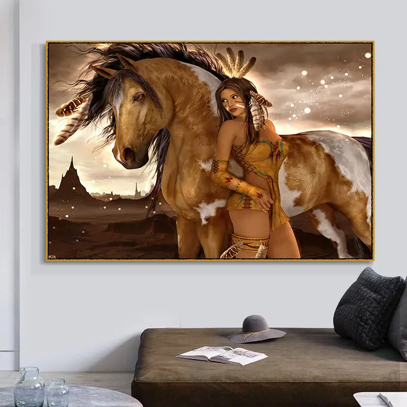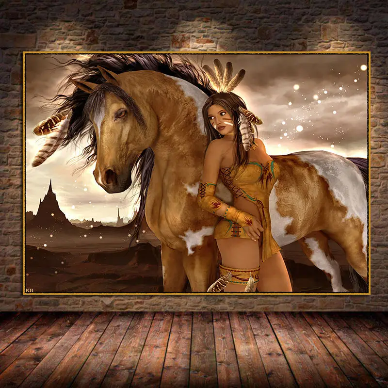Акварельная индийская женщина с перьями, картины на холсте, поп-арт...