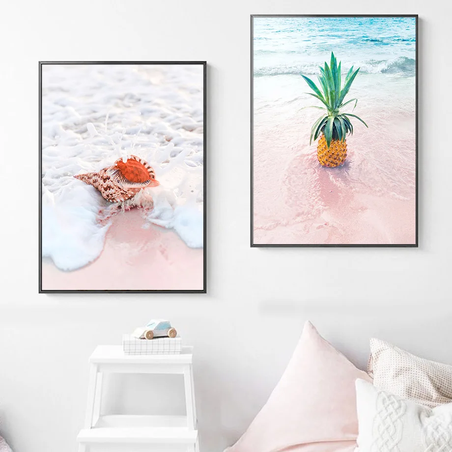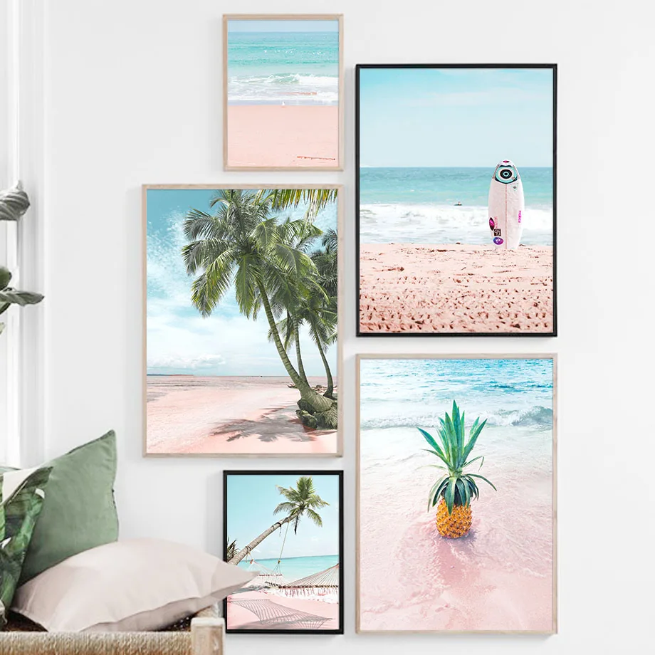 Настенная картина розового цвета с изображением пляжа, ананаса, гамака, скандинавские постеры и принты, Картина на холсте, украшение для гостиной, Настенная картина
