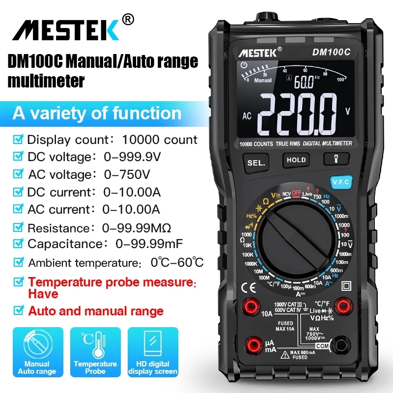 1.DM100C: ручной/автоматический диапазон, измерение температуры, температура окружающей среды