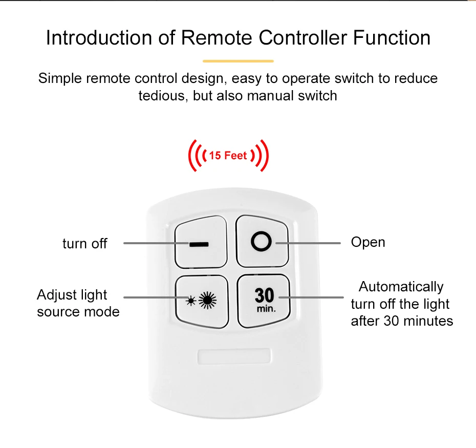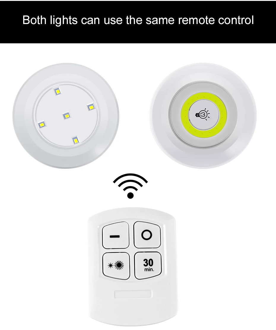 Спецификация: Светильник источник света: COB светодиодный/SMD2835 Крепление: клейкая лента Светильник Тип батареи: 3 батарейки типа AAA (не входят в комплект) Тип батареи дистанционного управления: 2 батарейки ААА (не входит в комплект) Тип переключателя: кран или пульт дистанционного управления Расстояние управления: до 15 футовРазмеры: 3,5X3,5X0,97 дюймов/Размеры: 90X90X25 мм Супер-яркий светодиодный светильник:COB или SMD2835 лампа, достаточно яркая, чтобы убедиться, что вы никогда не спотыкаетесь в темноте идеально подходит для вашей кухни, шкафа, шкафа, спальни, книжного шкафа, кладовой, прихожей, лестницы, шага, подсобное помещение, подвал и т. Д. Настройки регулировки яркости и таймера:Есть 2 режима регулировки яркости на светильник и функции синхронизации (30 минут), вы можете свободно регулировать светильник в соответствии с вашими потребностями. Простая установка:Простая установка, без жесткой проводки. С двухсторонними клейкими накладками и встроенным магнитом, вы можете приклеивать куда угодно. Режим TwoControl:Поверните светодиодный светильник шайбы с помощью пульта дистанционного управления или кнопки пресс-купол вручную. Лучший пульт дистанционного управления Дальний диапазон около 15 футов. Прост в использовании и очень удобен в управлении.