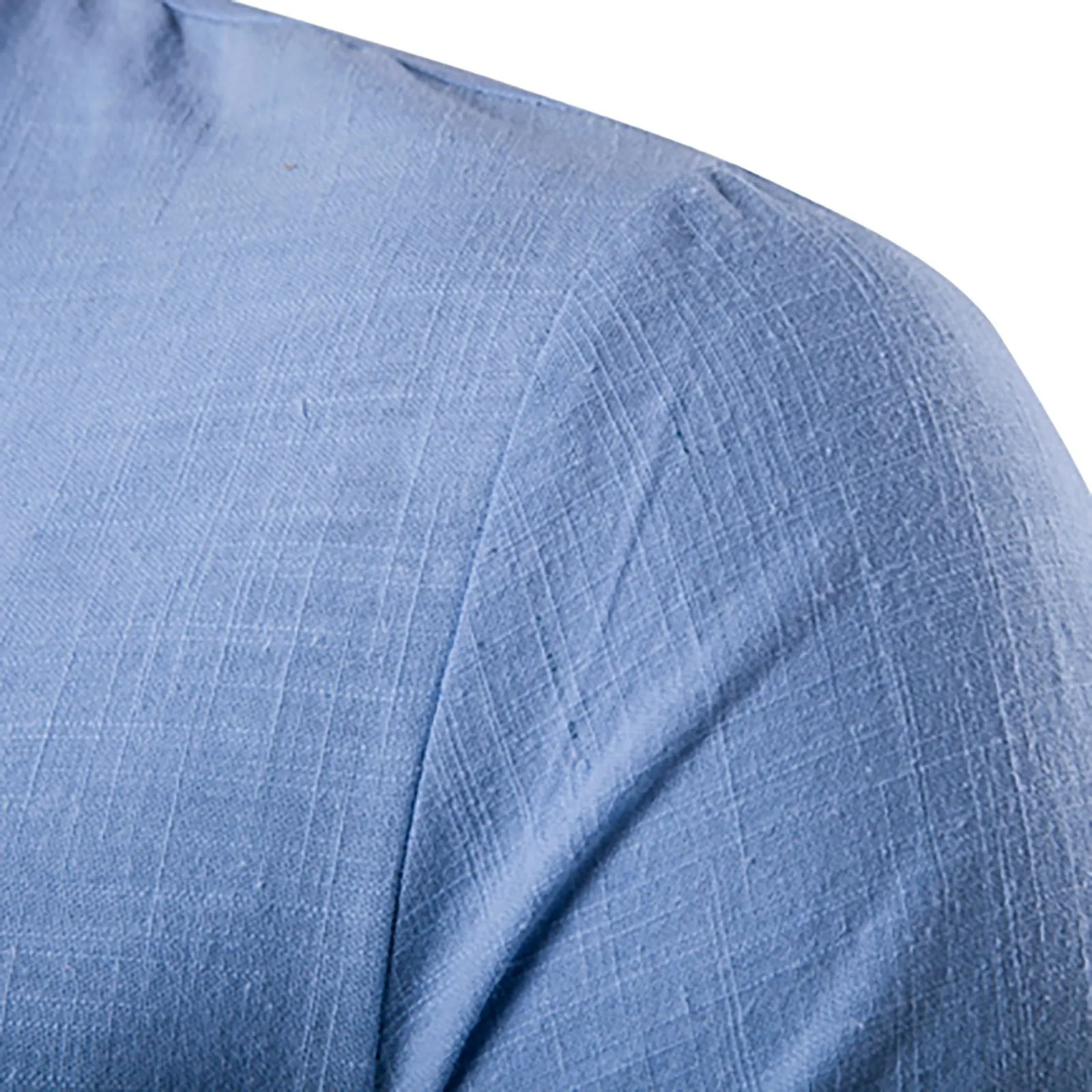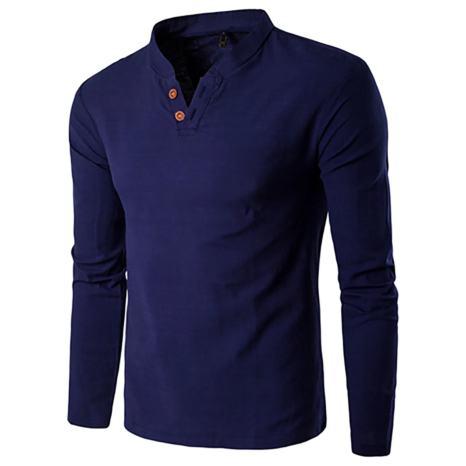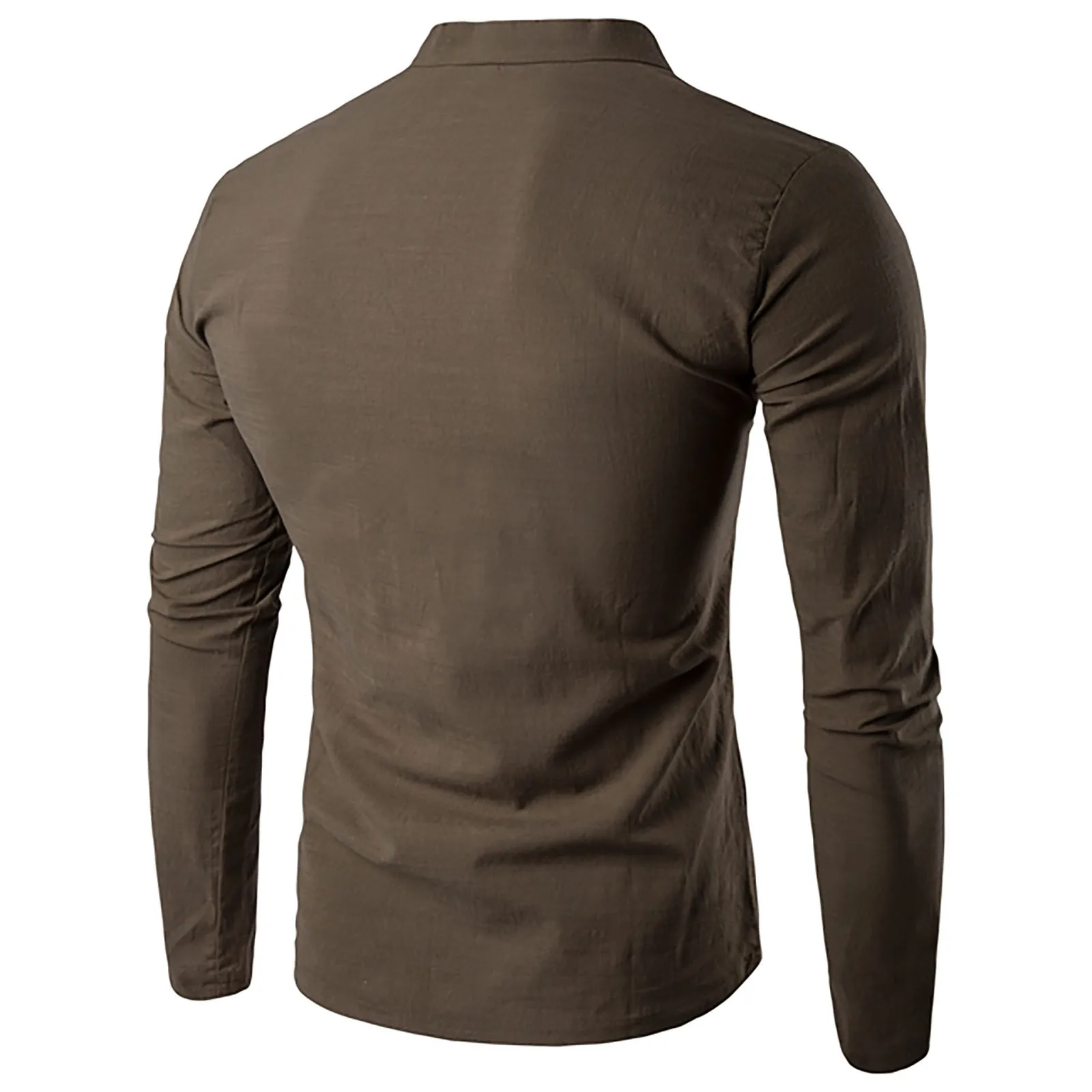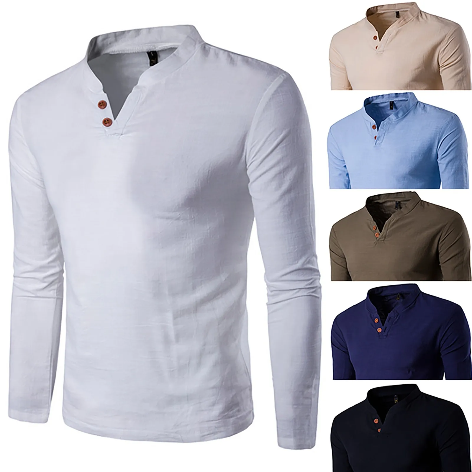 Футболка мужская с воротником-стойкой, хлопково-Льняная Однотонная рубашка с длинными рукавами, на пуговицах, одежда на лето