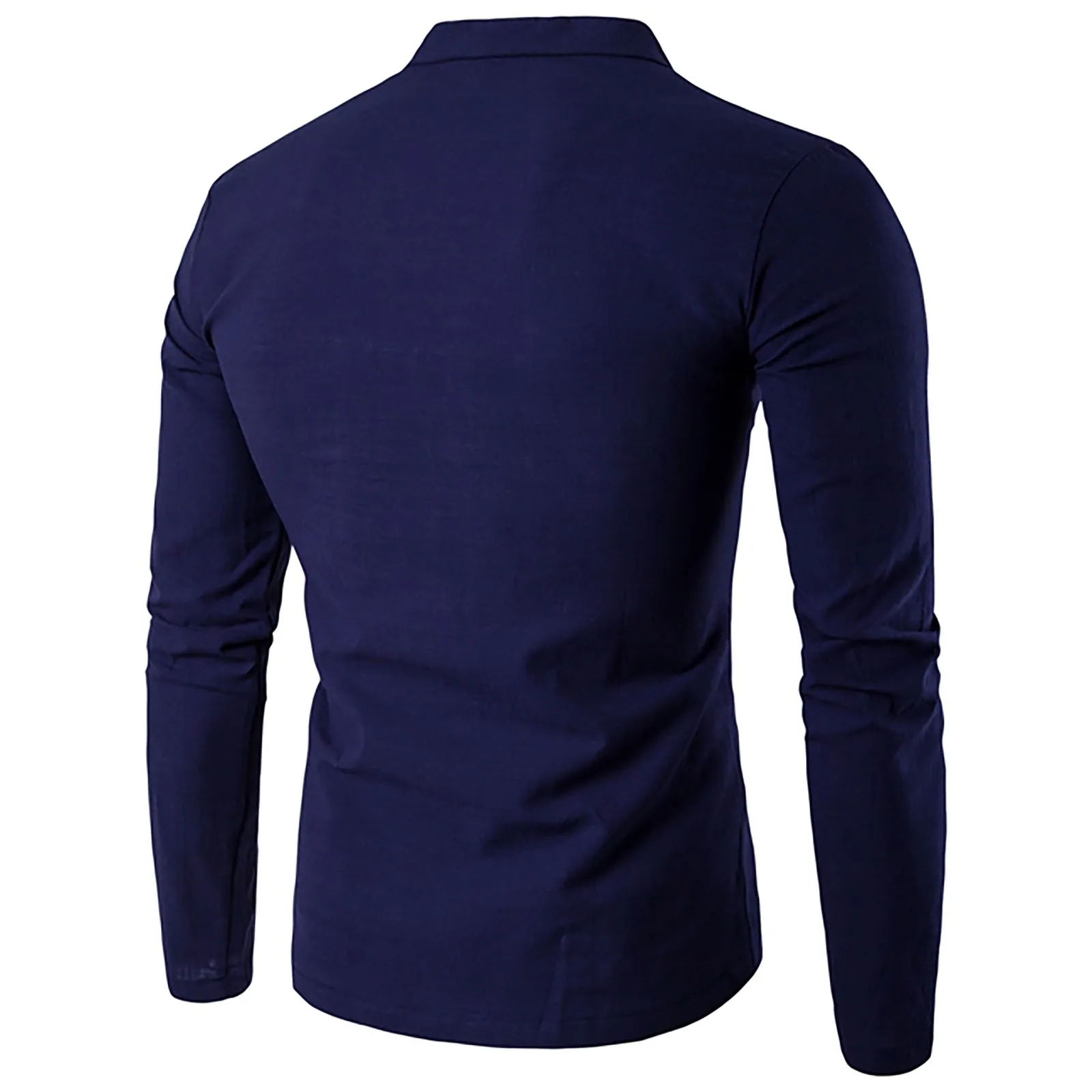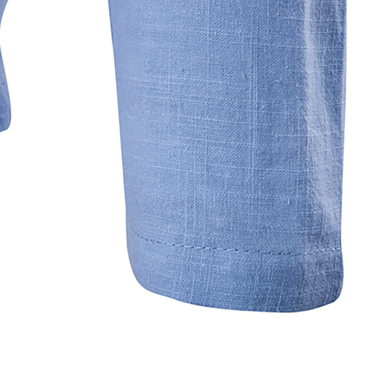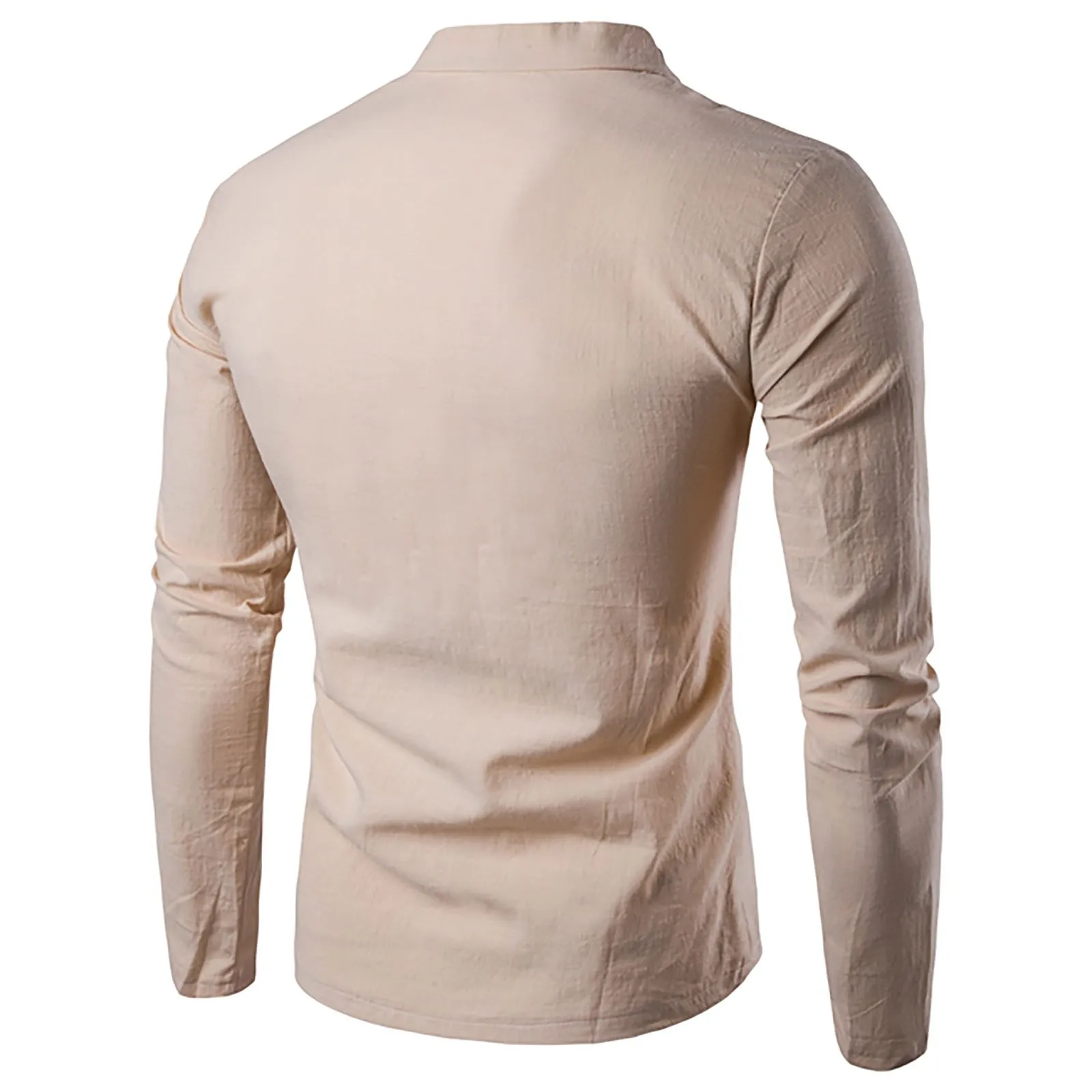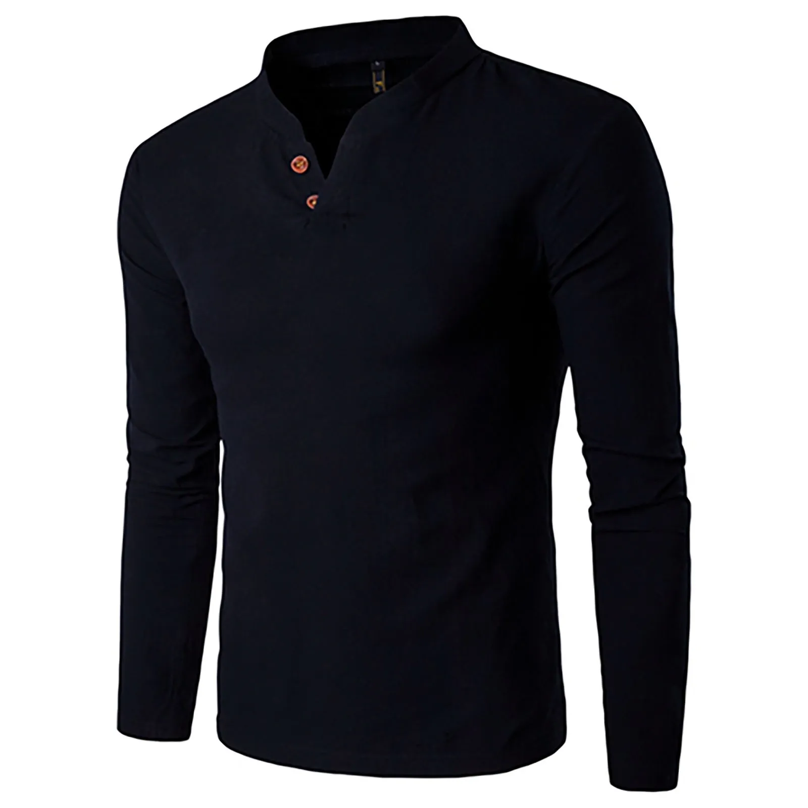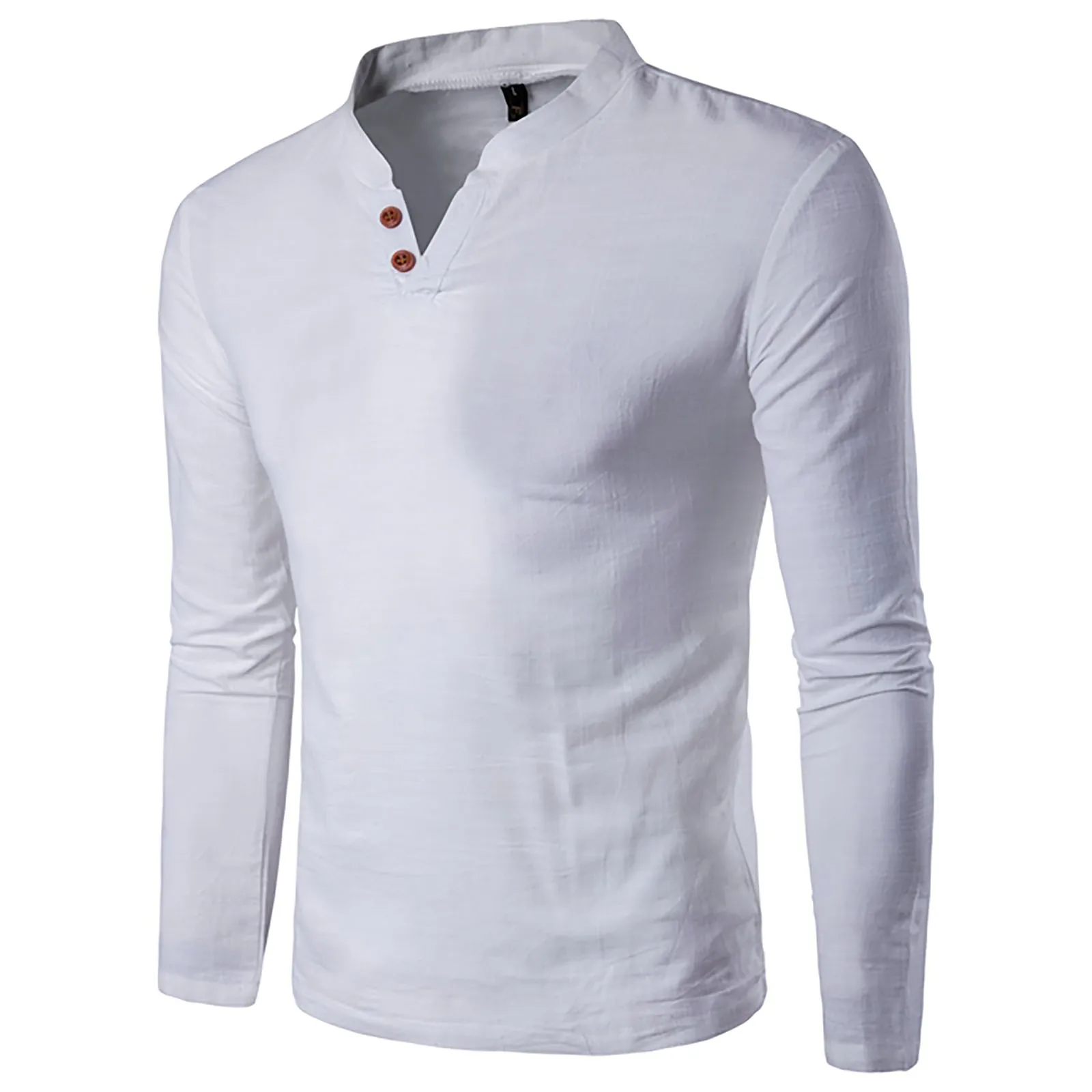 Футболка мужская с воротником-стойкой, хлопково-Льняная Однотонная рубашка с длинными рукавами, на пуговицах, одежда на лето